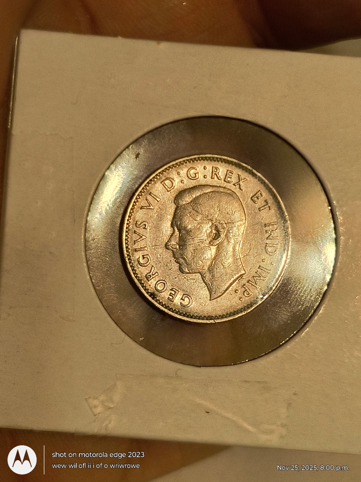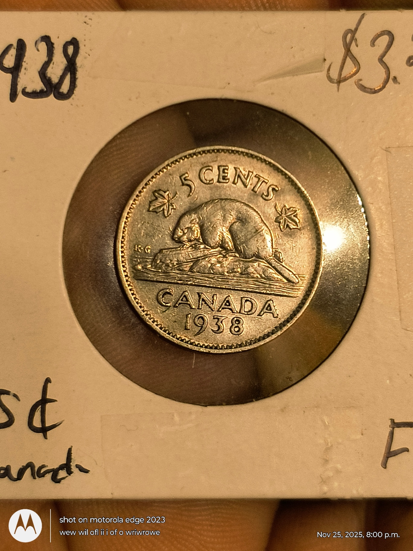 : a 1938 Canadian five-cent piece featuring a beaver, and a George VI portrait coin.