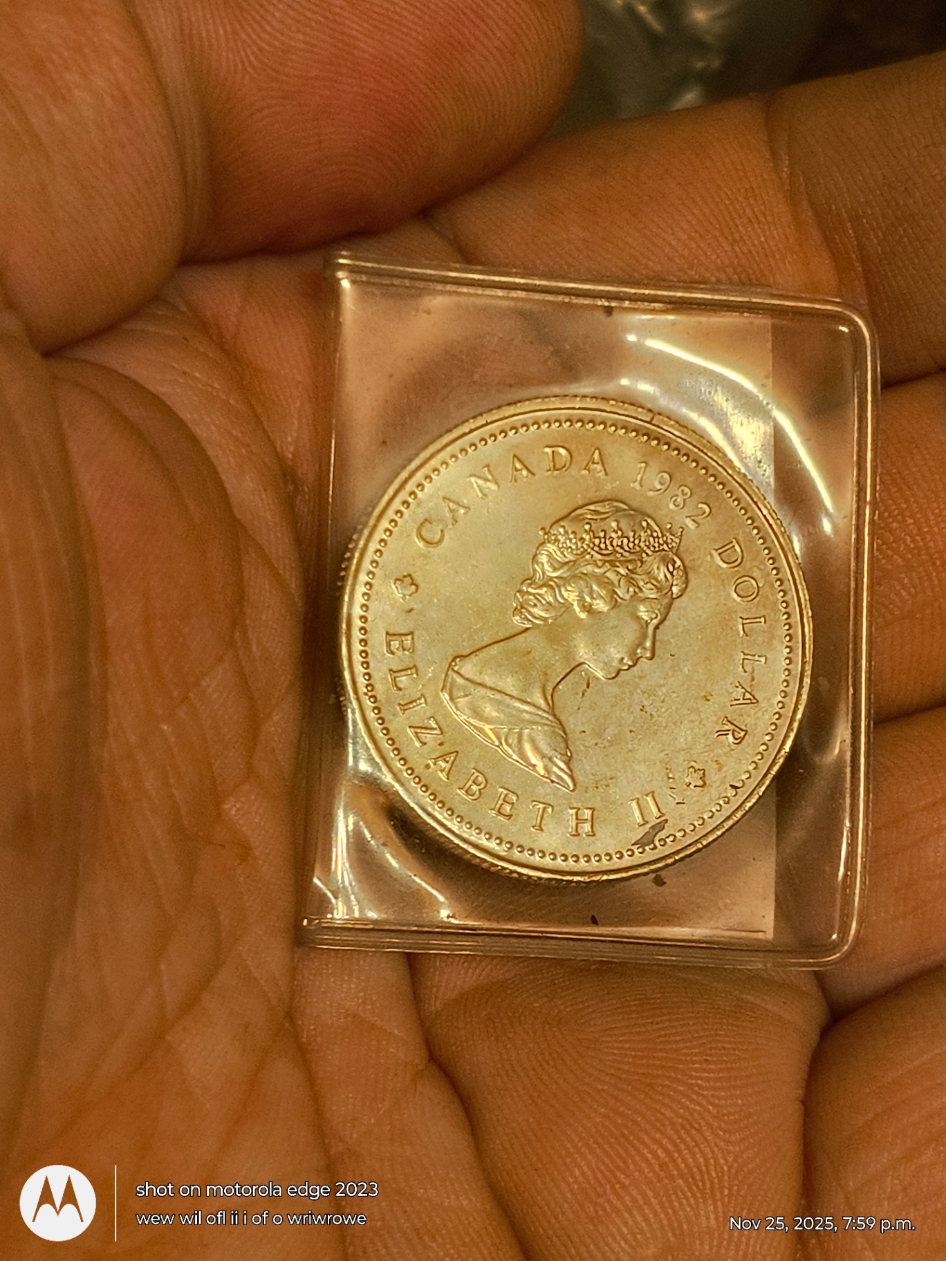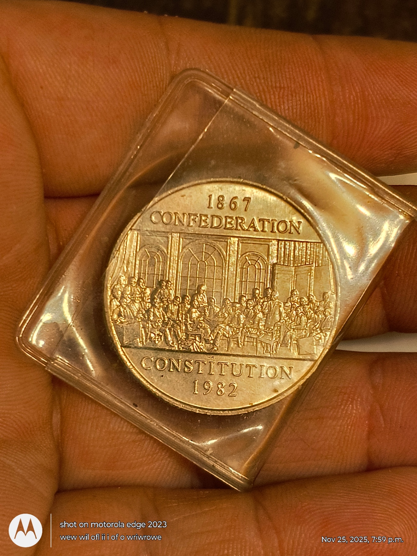 Two coins sealed in clear plastic cases: a commemorative coin reading '1867 Confederation Constitution 1982' and a 1972 Canadian one-dollar coin depicting Queen Elizabeth II.