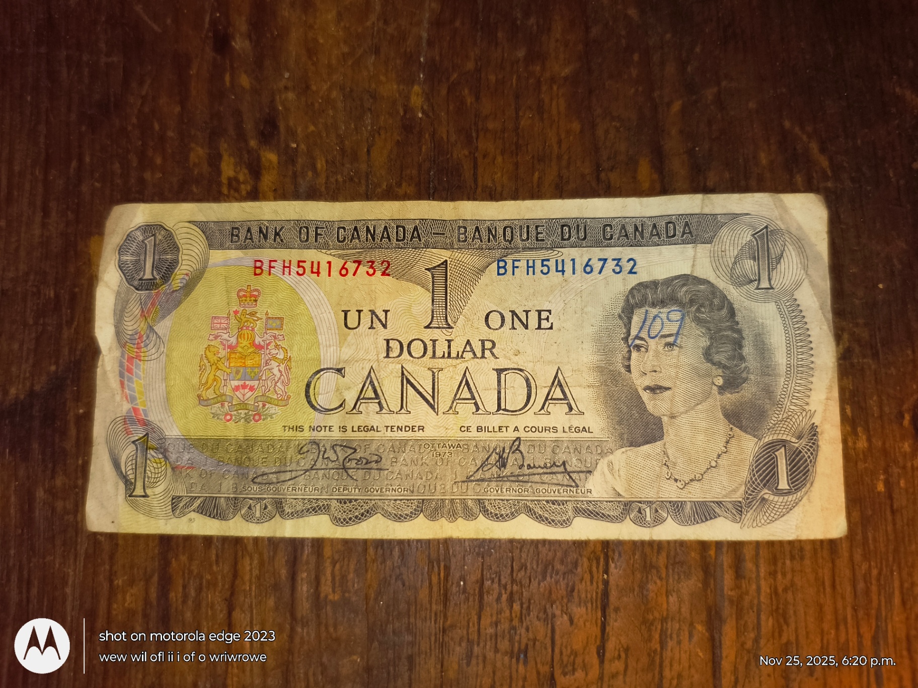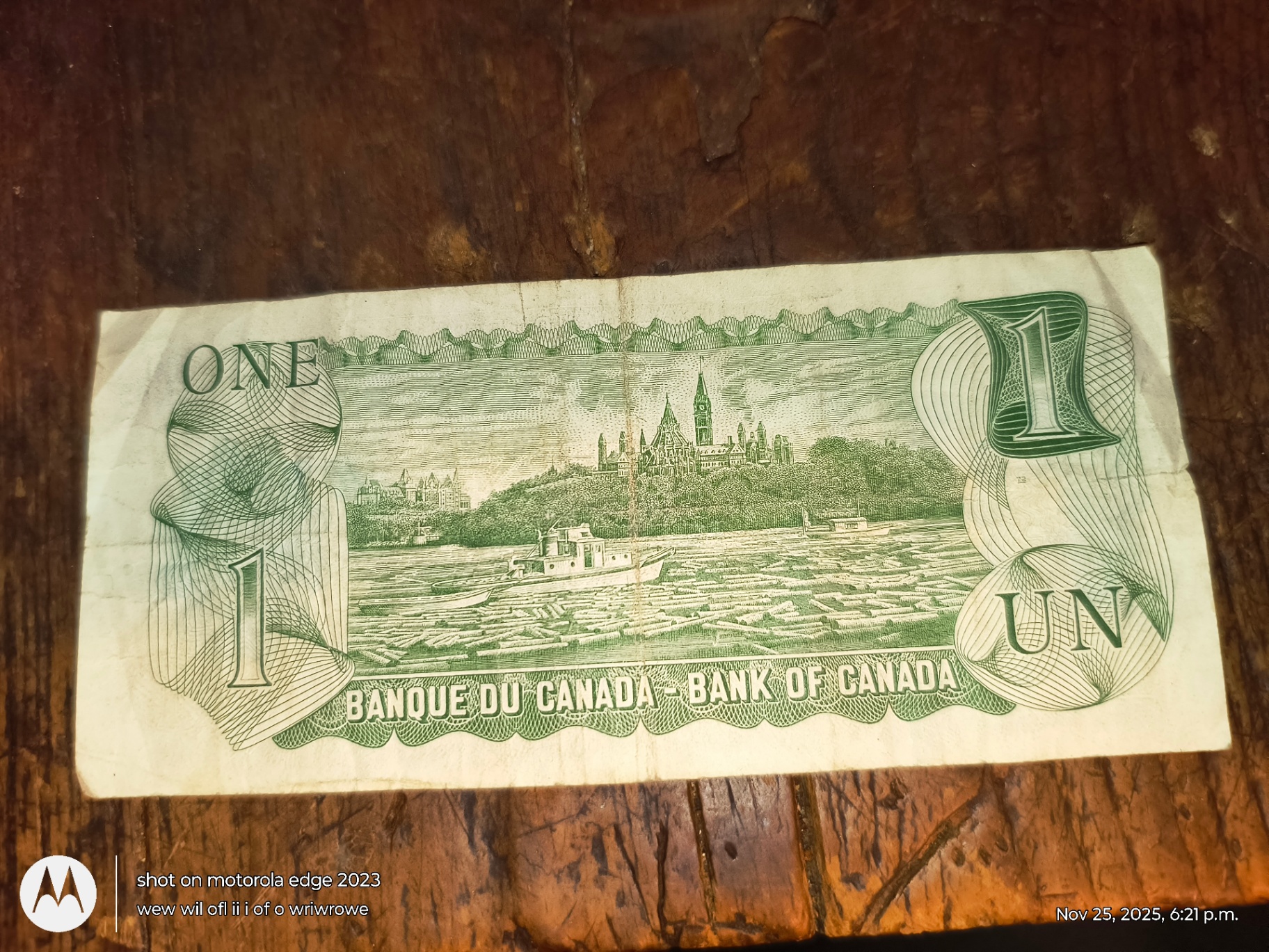 Two one-dollar banknotes from the Bank of Canada. The obverse features a portrait of Queen Elizabeth II and official insignia, while the reverse shows a cityscape and river scene.
