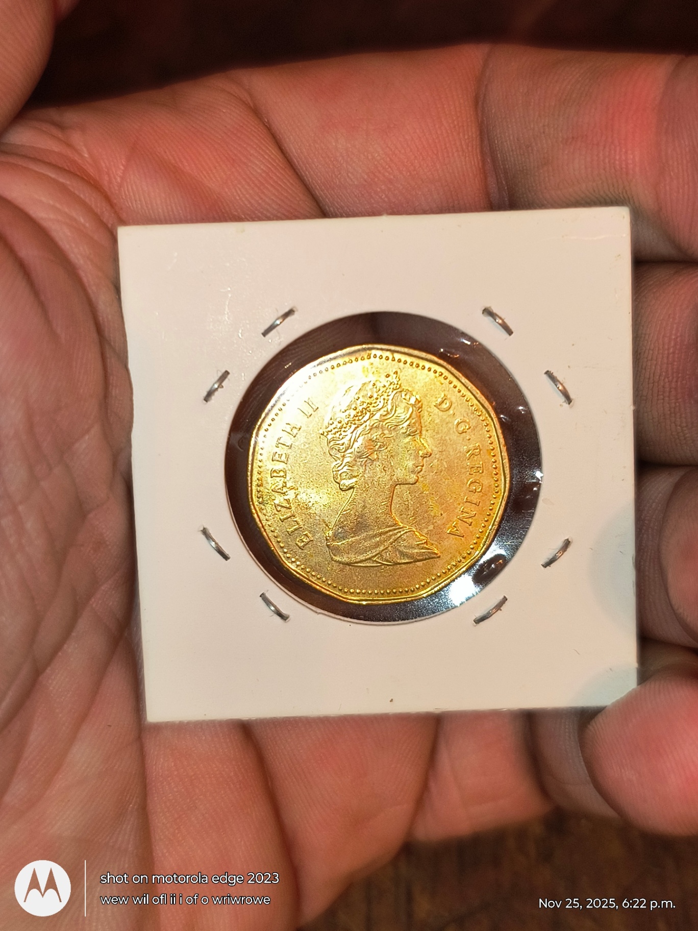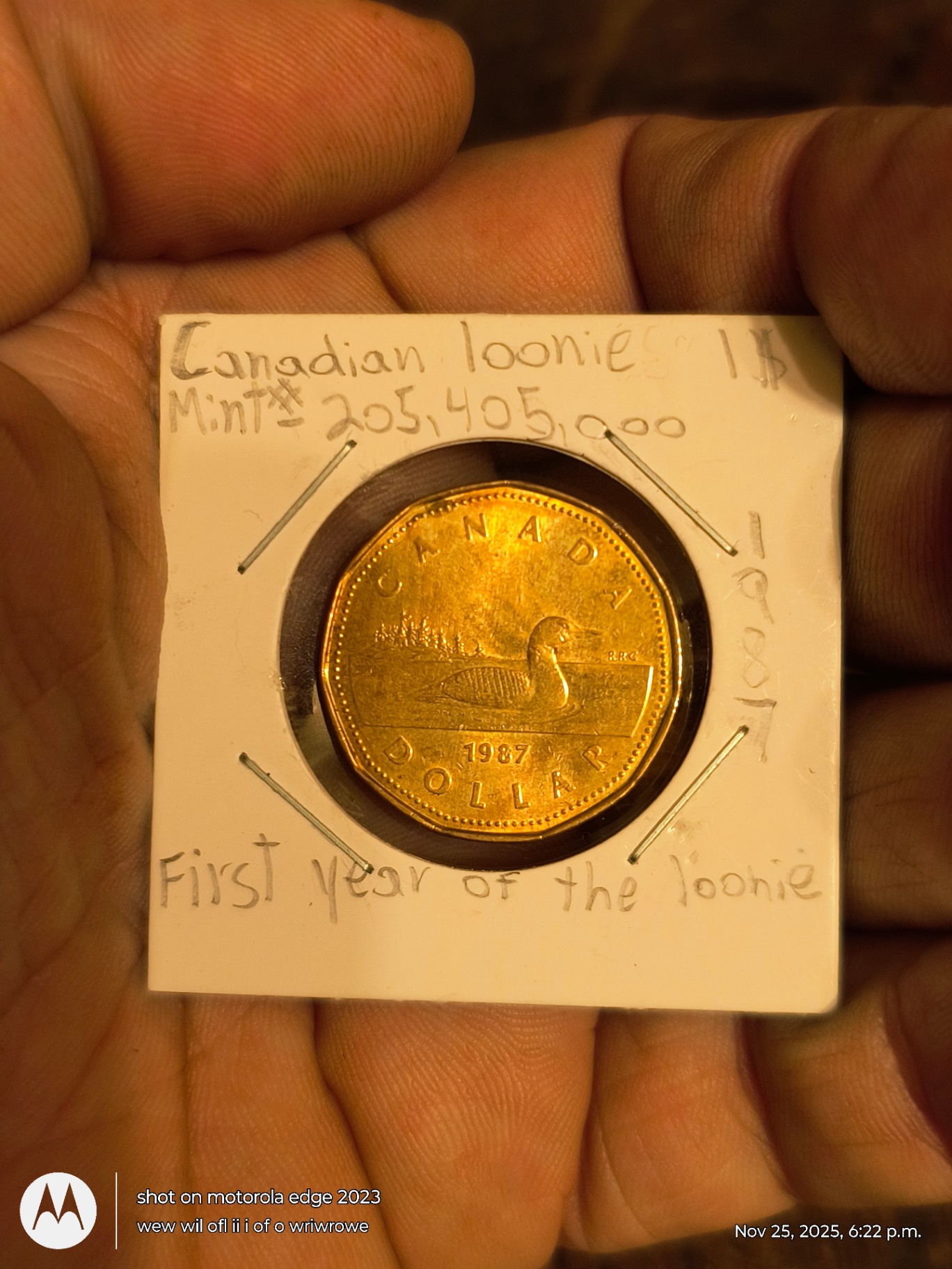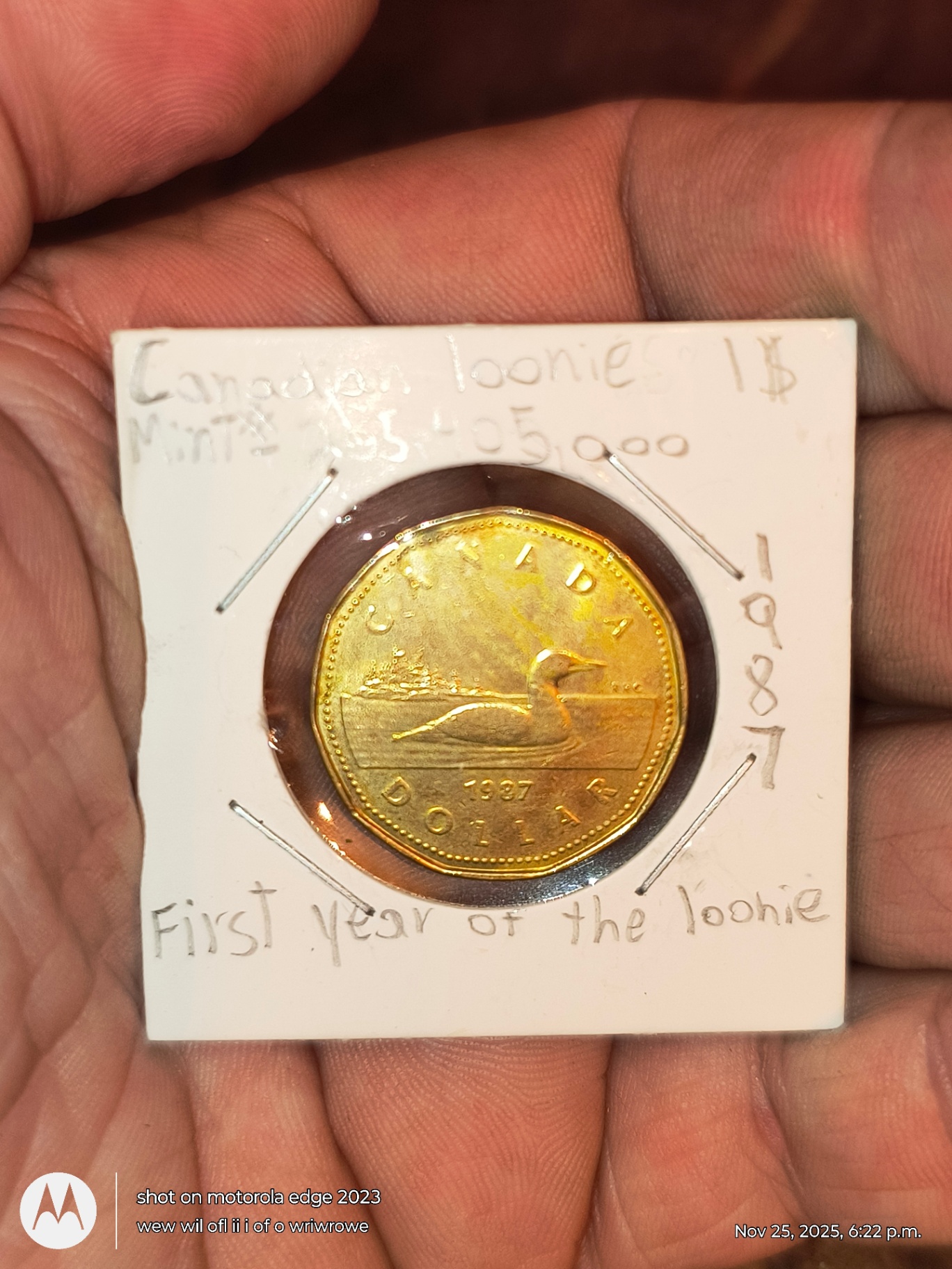 Canadian one-dollar coins (loonie) from 1987, each showing the loon design on the reverse and Queen Elizabeth II on the obverse; both identified as the first year of the loonie.