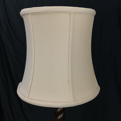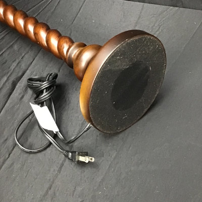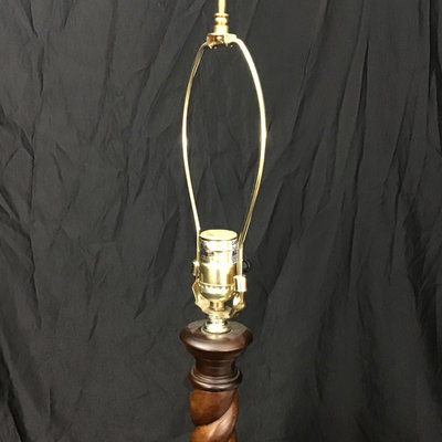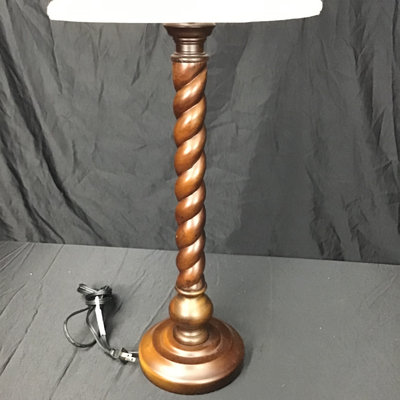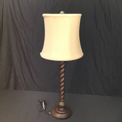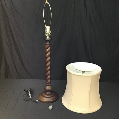 Wood candlestick twist lamp base, 23.5h to bulb, with 12.5d cream shade and celadon crackle ceramic finial. 32h overall. Works. 1 piece.