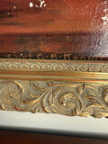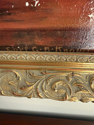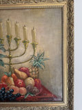 A framed still-life painting depicting a bouquet of roses in a glass vase, a brass candelabrum with candles, assorted fruit (grapes, pineapple, apples/pears),