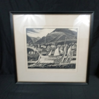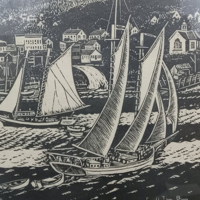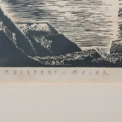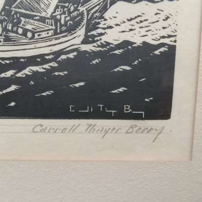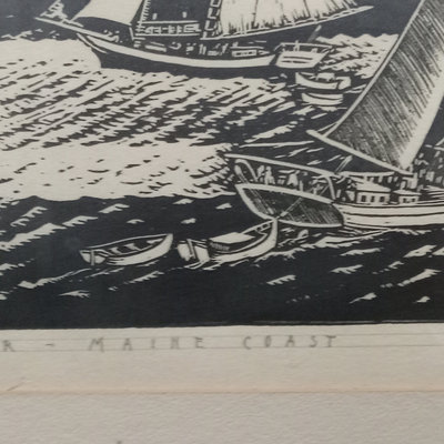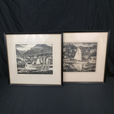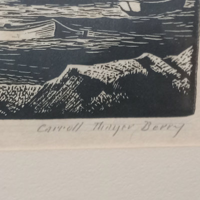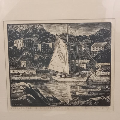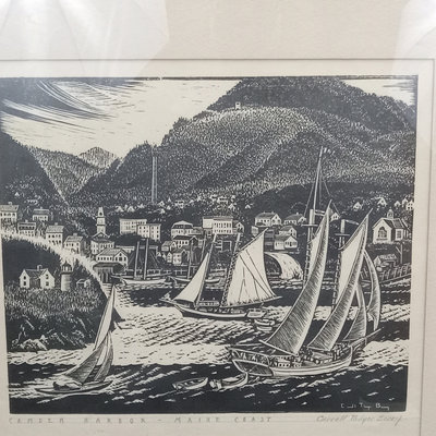 Carroll Thayer Berry (American, 1886-1978). "Camden Harbor - Maine Coast" and "Windjammer in Rockport - Maine" wood engravings, signed and titled in pencil. Art 11x13, frame 18x19. 2 pieces.