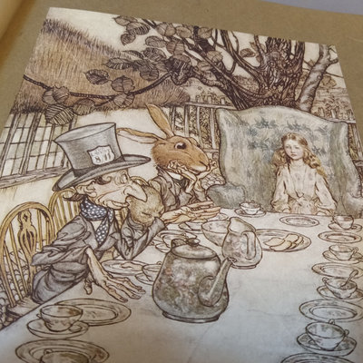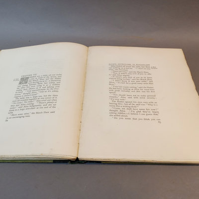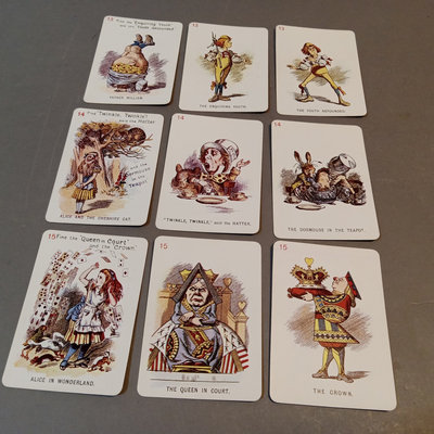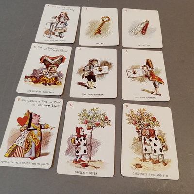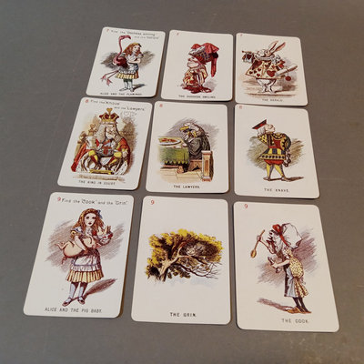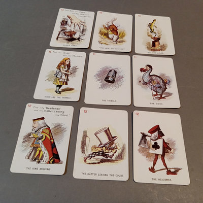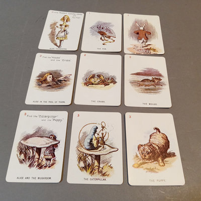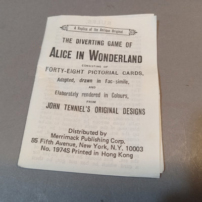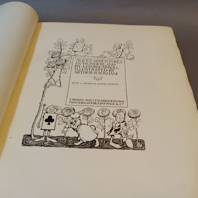 Alice's Adventures in Wonderland by Lewis Carroll, illustrated by Arthur Rackham, no. 505/550, Doubleday, Page & Co., New York, 1907, large quarto, fair condition with cracks in end papers. Alice in Wonderland Card Game Set, antique replica of 48-card deck from John Tenniel's original designs, Merrimack Publishing Corp, printed in Hong Kong 1974. 2 pieces.