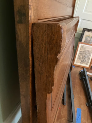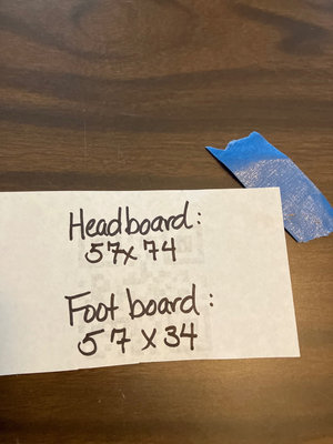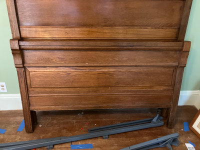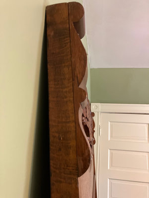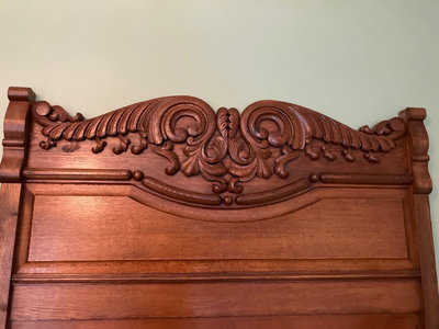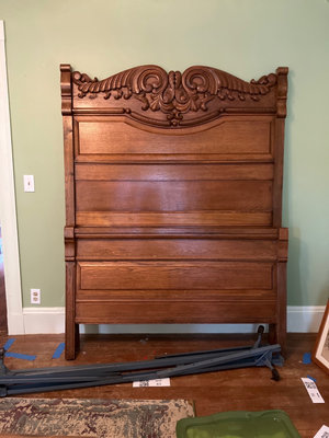 A large carved wooden headboard with ornate scrollwork and a matching footboard, accompanied by metal bed rail components, all shown together as a bed frame set.