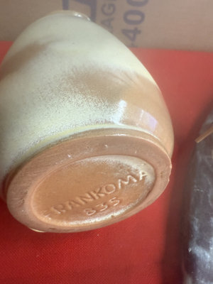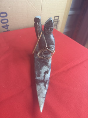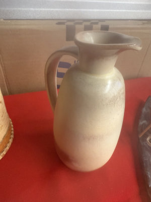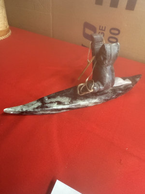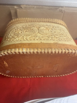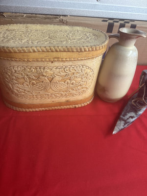 A collection of decorative antiques including a light wood carved box with intricate floral and bird motifs, a Frankoma pottery pitcher marked 853, and a curved eskimo soap stone sculpture