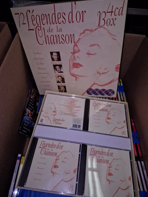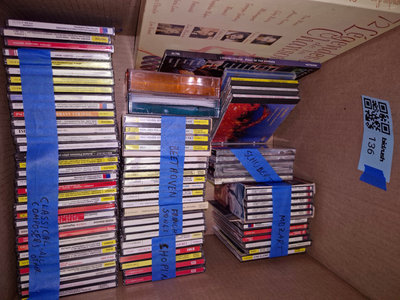 A large assortment of compact discs in jewel cases, organized with blue tape genre labels, including a four-CD box set titled Légendes d'or de la Chanson. Beethoven, Chopin, Schubert, Mozart. ** BRING HELP TO MOVE OUT OF BASEMENT
