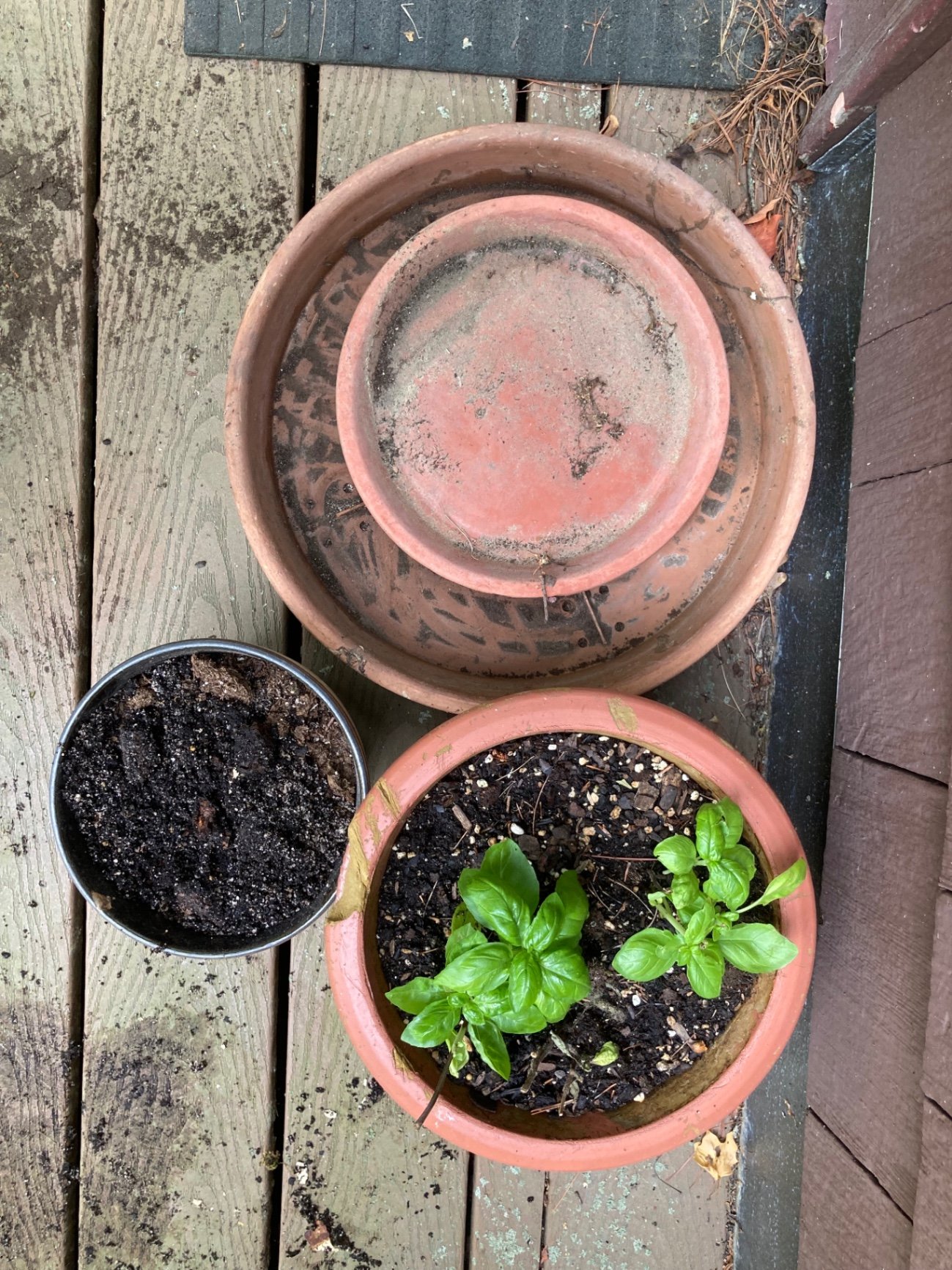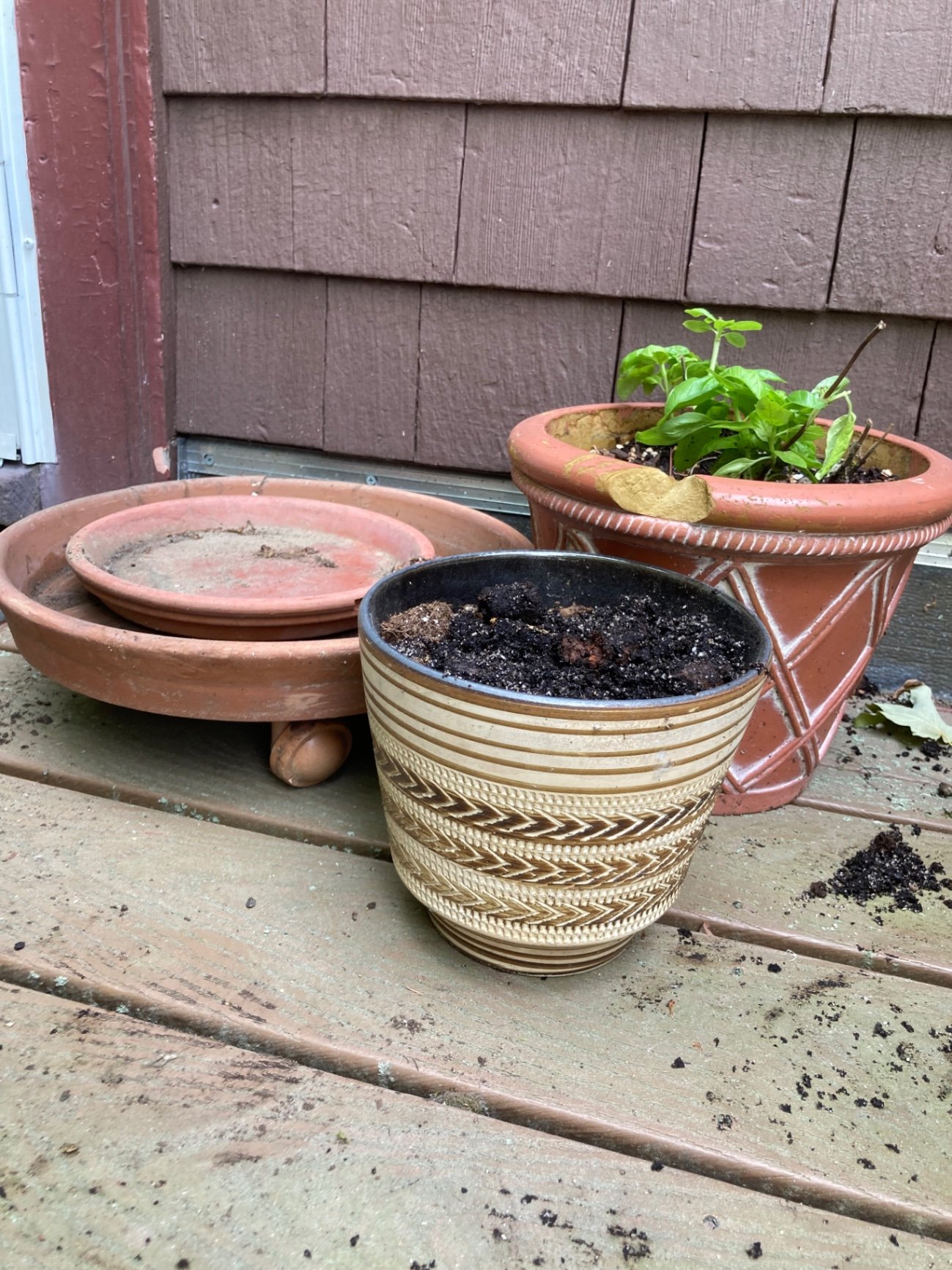 Terracotta planters, rolling plastic planter saucer and a patterned ceramic pot.