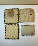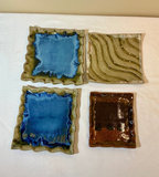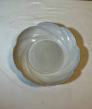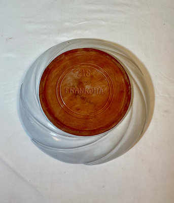 A group of glazed ceramic pottery pieces including a white scalloped Frankoma bowl, vases turquoise planter with saucer, small bottles, and art plate pieces.