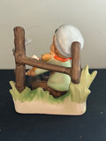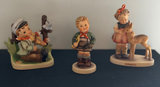 Far left figure: Arnart “Boy with a Violin. The blue mark featuring two crossed arrows is a known backstamp used on Arnart creations. 1950s-early 1970s. Item Number: "8349" is inscribed item number. Arnart produced several figurines of a "boy with a violin". These are typically hand-painted porcelain figures often depicting a boy in various poses, such as sitting down or standing by a fence. The one in the middle is a vintage M.I. Hummel "Trumpet Boy" figurine, also known by its model number 97. ( on bottom) Originally designed by Arthur Moeller in 1938, The hand-painted porcelain figure depicts a young boy holding a yellow trumpet. The figurine stands approximately 4.5 to 4.75 inches. Rare M.J. Hummel Girl with Deer :1947 # 136/1 is called “Friends” She stands 5.25” tall and is stamped 1947 on the bottom. No original boxes .
