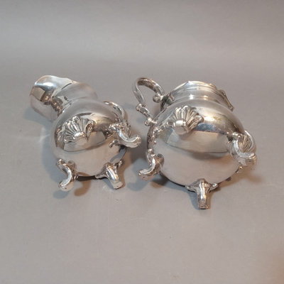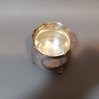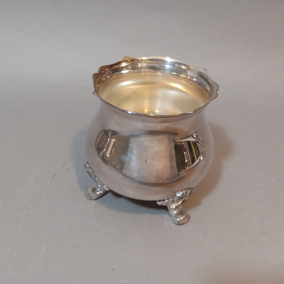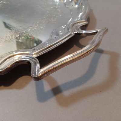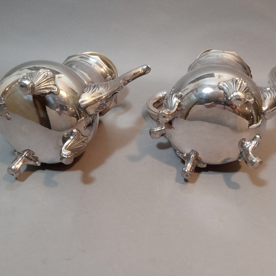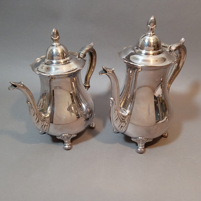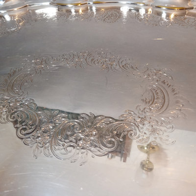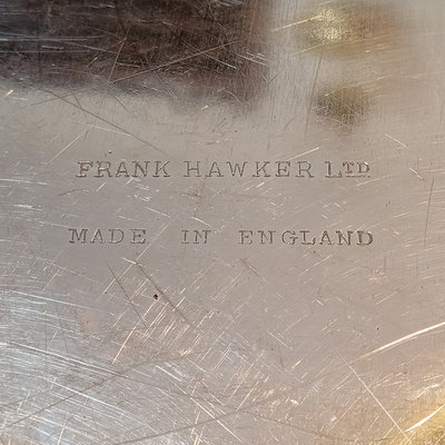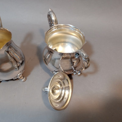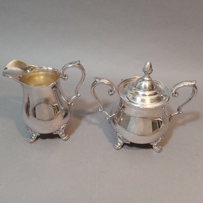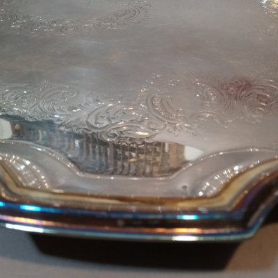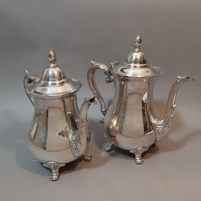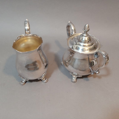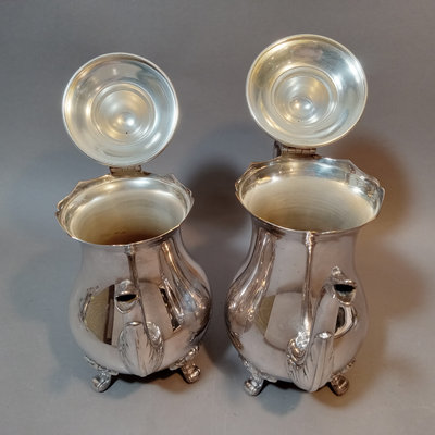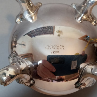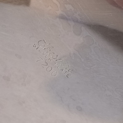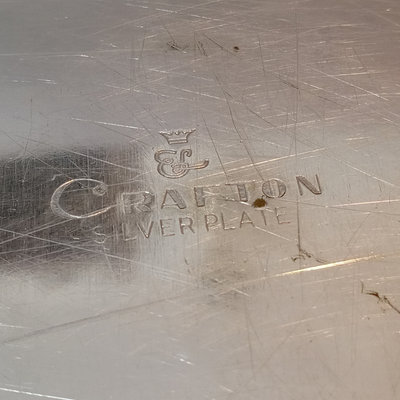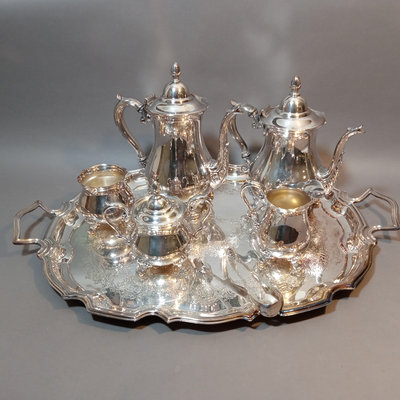 Cheshire no. 7200 silverplate coffee and tea service, includes 10h coffee pot, 9h tea pot, 4.75h creamer, 5.5h lidded sugar bowl, and 3.5h slop pot. Crafton Silverplate serving tray, from Frank Hawker Ltd., made in England, 16x20. Sugar tongs with illegible mark, possibly coin silver. 7 pieces.