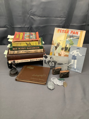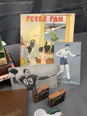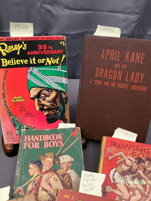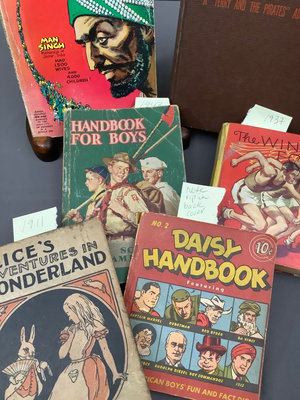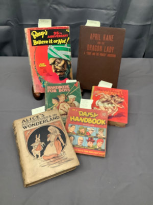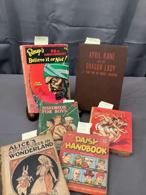 Jack Dempsey and Y.A.Tittle trading cards, circa 1920. Daisy Handbook, featuring Captain Marvel, Robotman, Red Ryder and more. A Boy Scout handbook 1943. Norman Rockwell cover art, 1937. The Winged Four No.1131. Milton Caniff's April Kane and the Dragon Lady, A “Terry and the Pirates” Adventure Tale, 1942. Alice’s Adventures in Wonderland, 1911. Wood block stamps, amusement tokens, and more. 10 plus pieces.