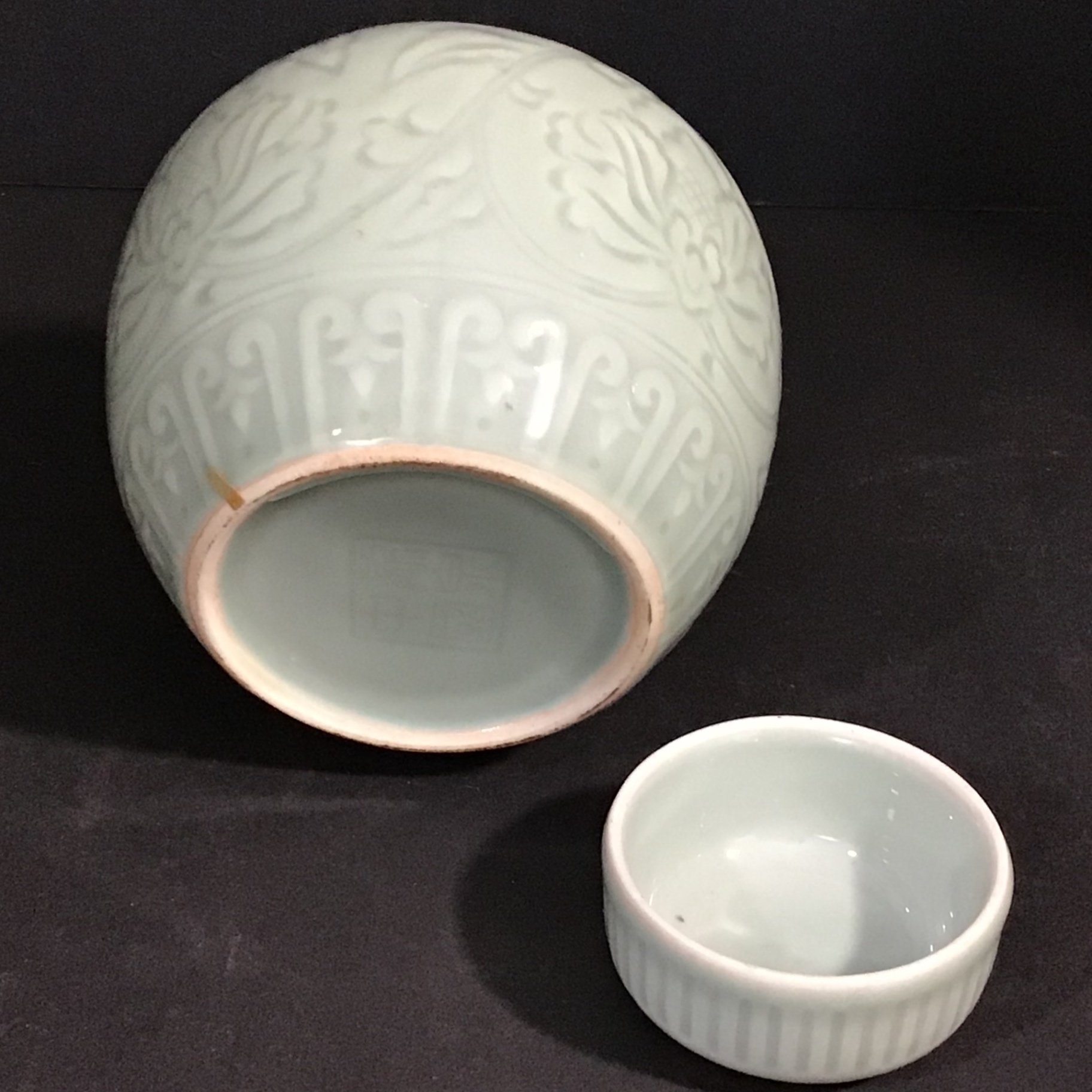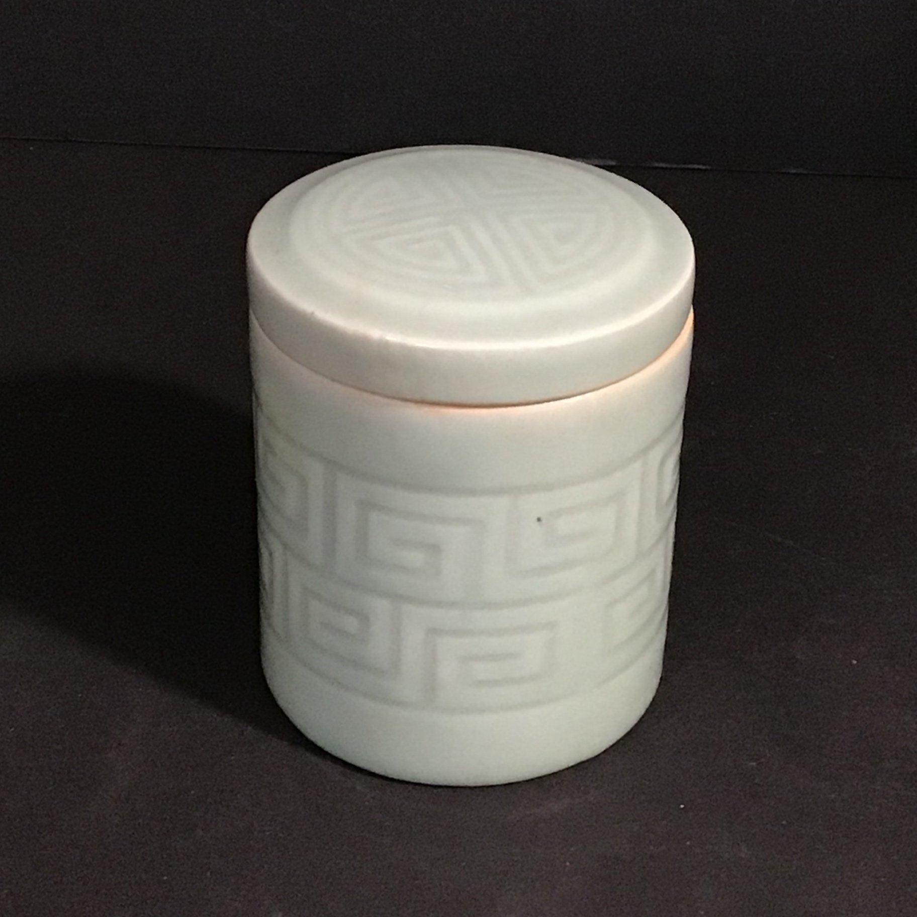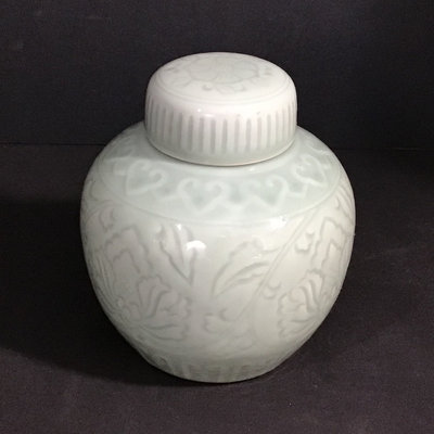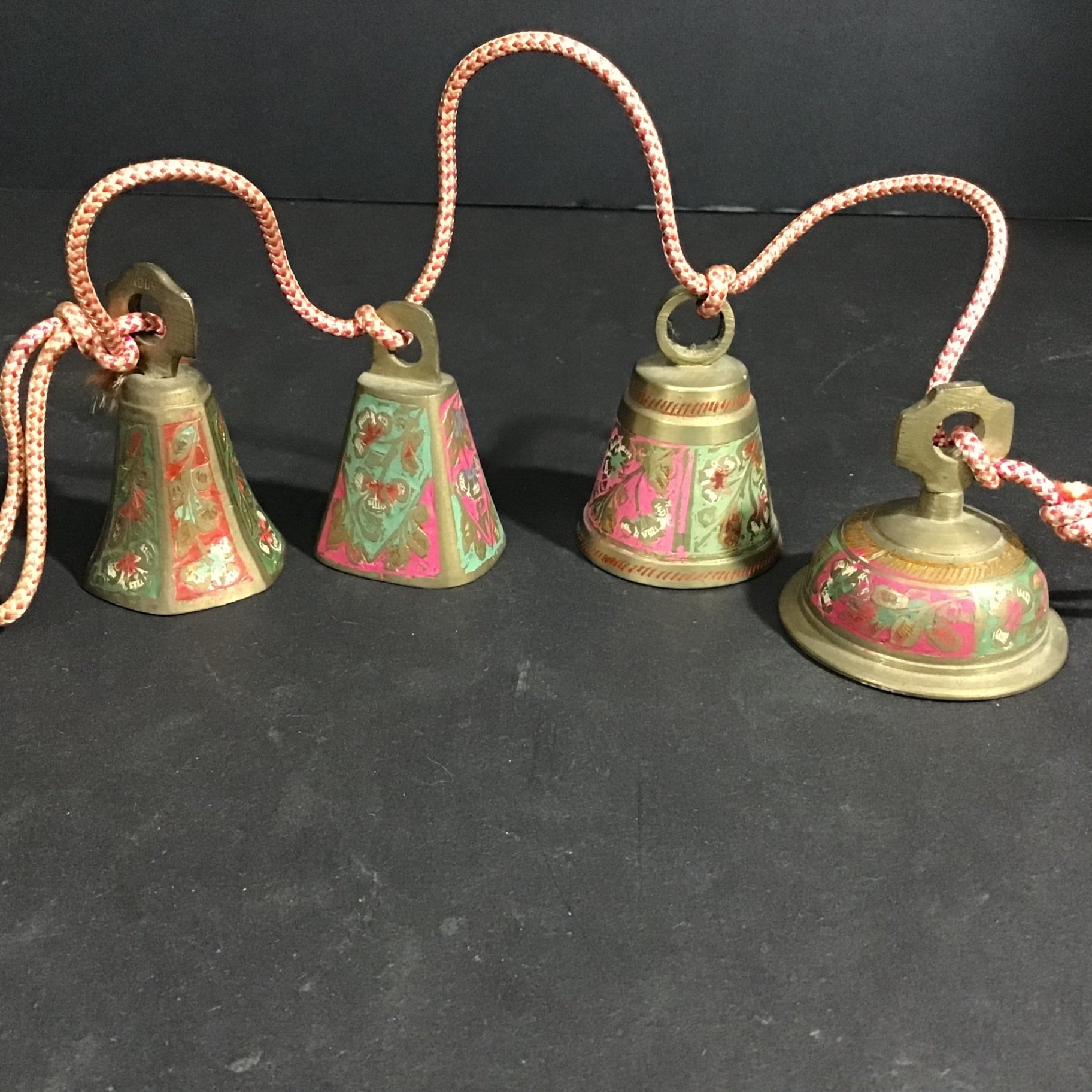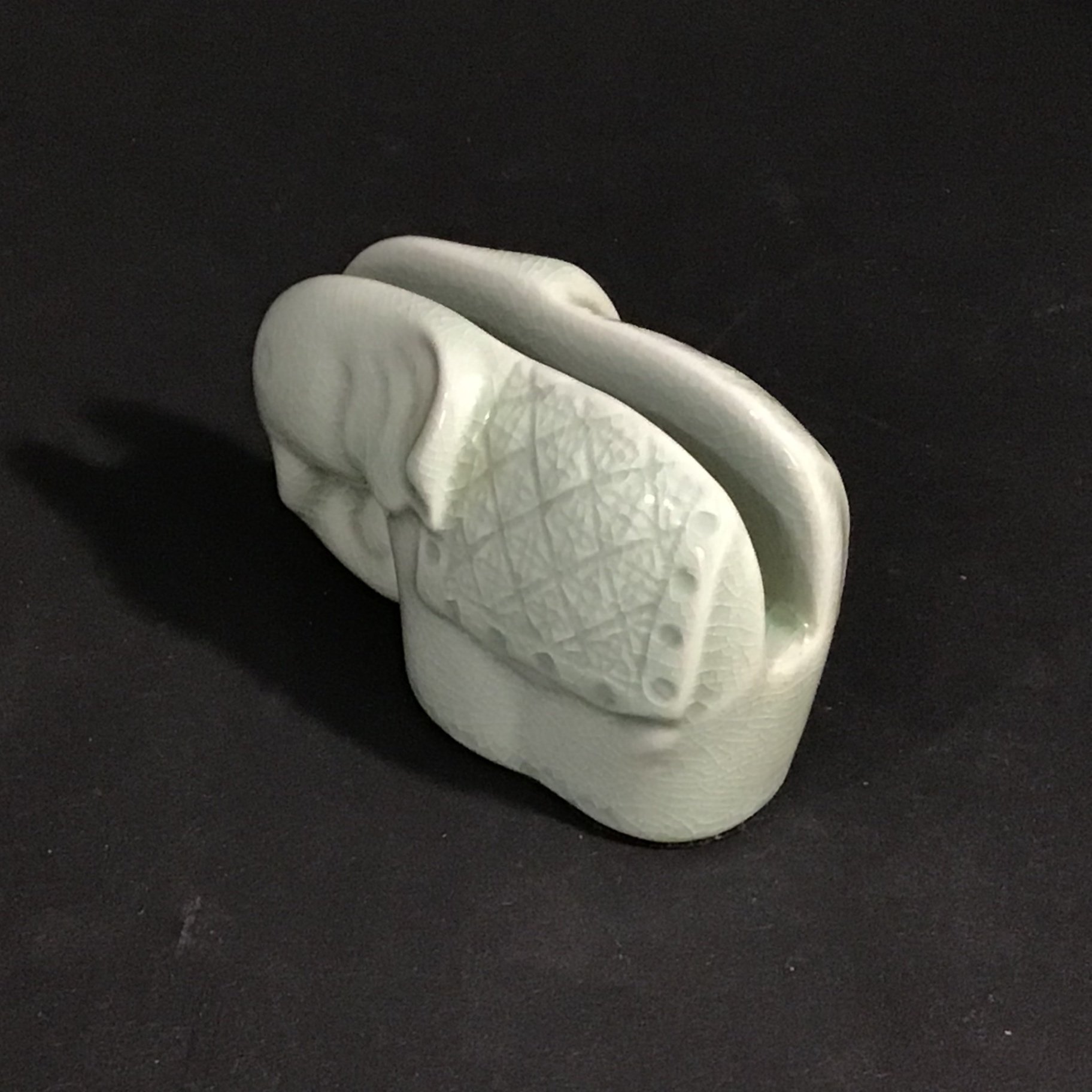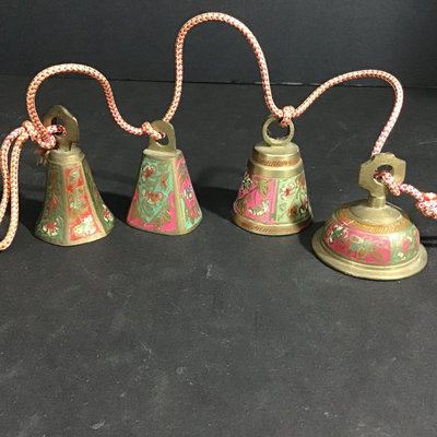 Celedon ginger jar, 6dx6h. Crackle vase or wide-neck planter, 6.5h x 9d at rim. Small tea canister, 4d x 3.25h. Elephant napkin holder, 2.5h. Pink and green painted brass bells on cord, perfect for hanging on a door. 5 pieces.