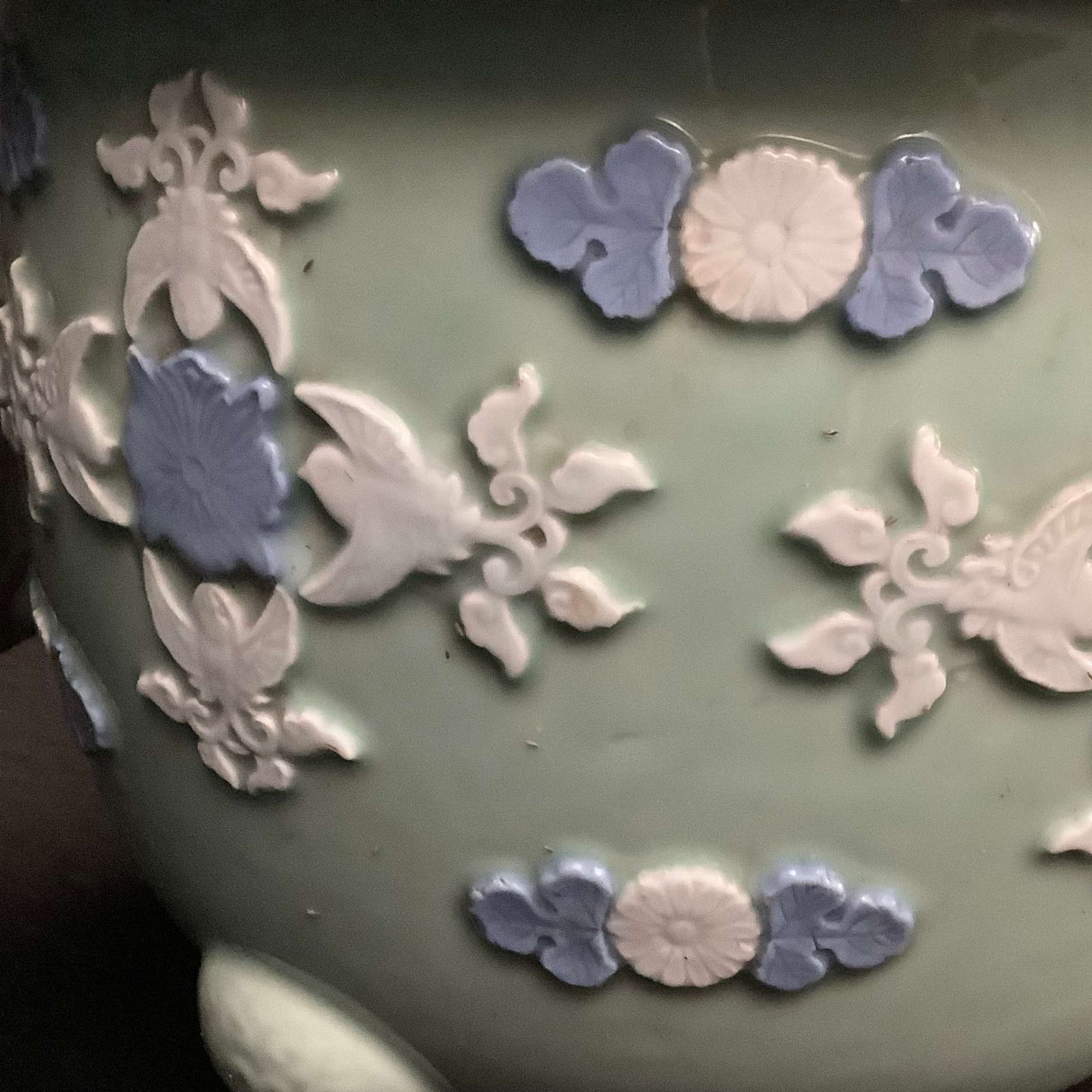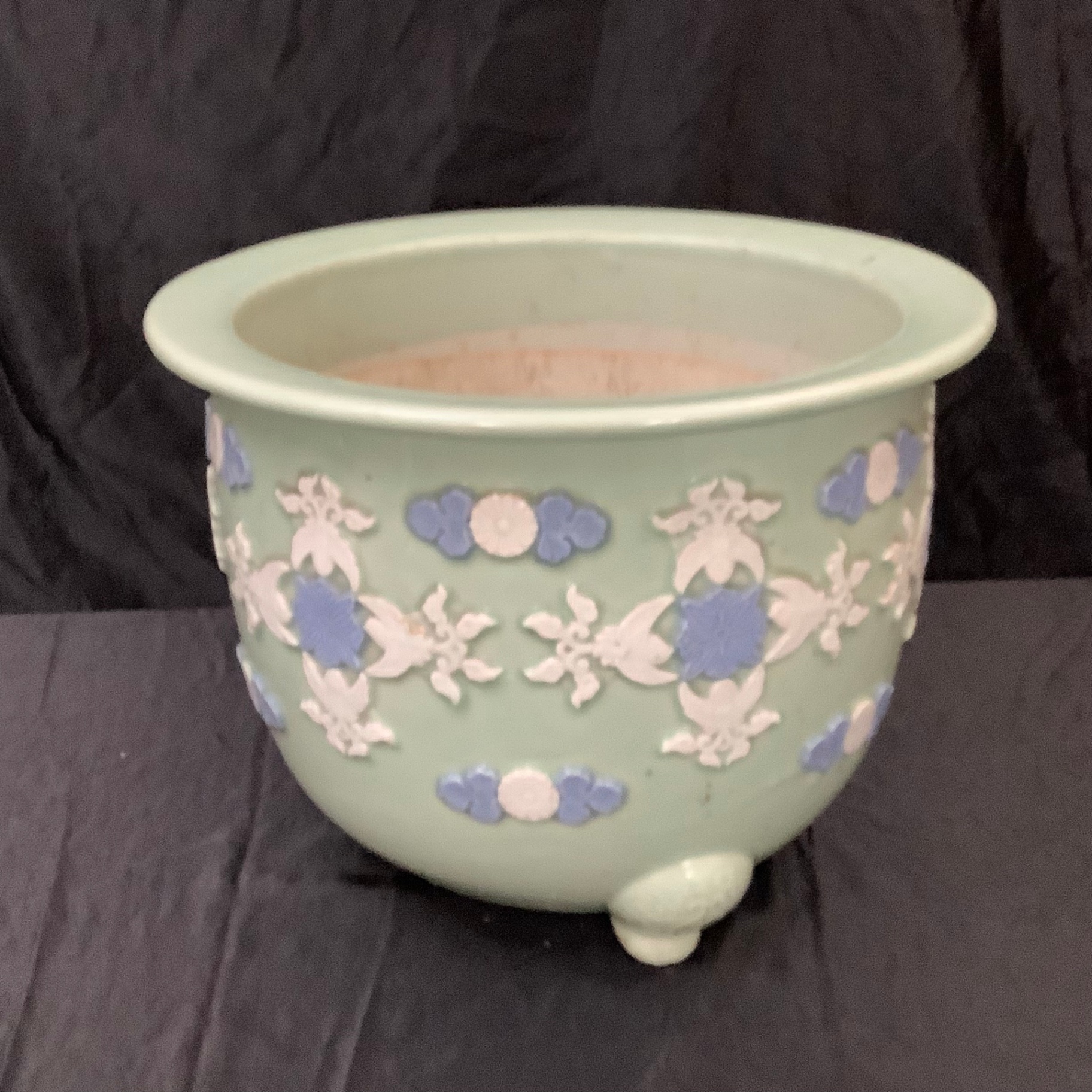Chinese footed planter, celedon green background with raised blue and white design, 16d. x 12h. 1 piece.