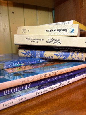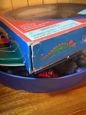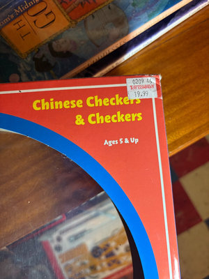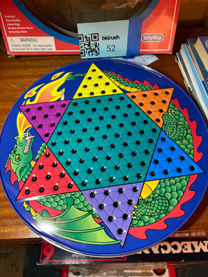 A collection including a boxed Chinese Checkers & Checkers game with marble pieces in mesh bags, a round colorful game board with a dragon motif, and a stack of assorted books. **BRING OWN PACKING MATERIALS, NOT TESTED FOR COMPLETENESS.