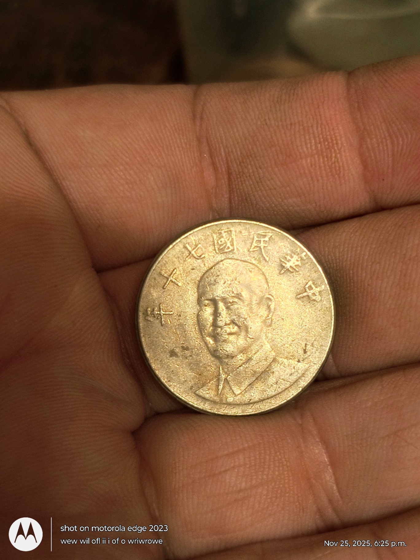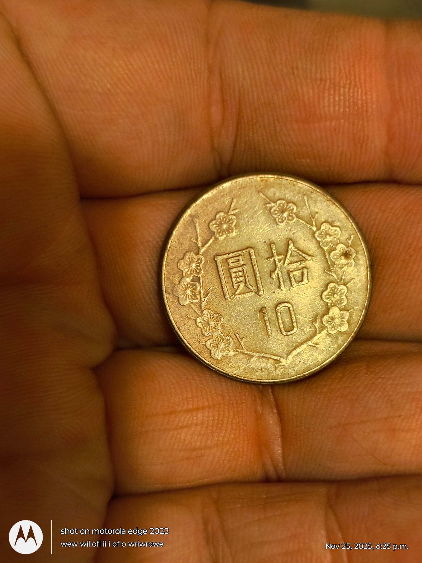 featuring Chinese inscriptions. One coin displays a portrait with surrounding characters, the other has a floral border with the characters and the denomination '10' in the center.