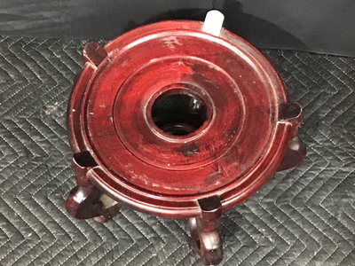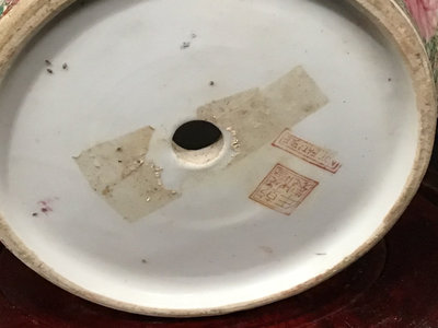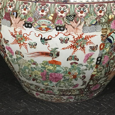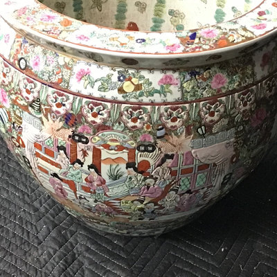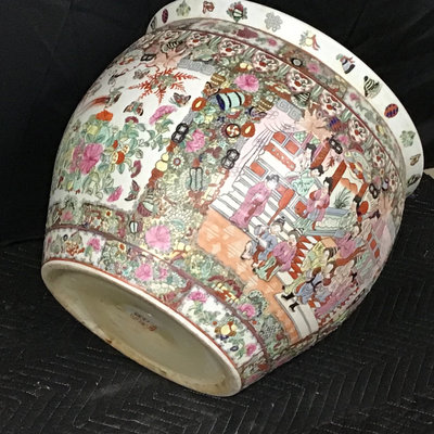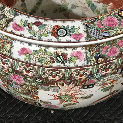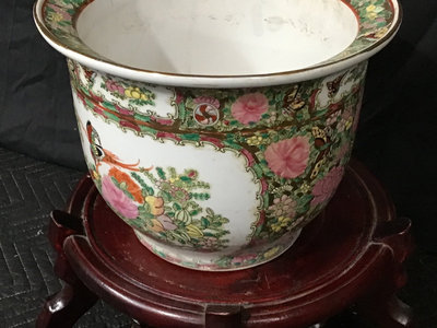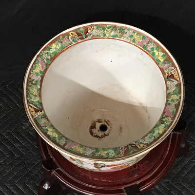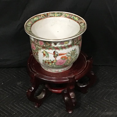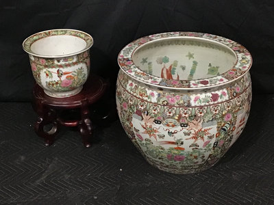 Vintage Chinese Rose Medallion patterned porcelain fish bowls, traditionally used for koi or goldfish, more currently used as planters. Chop on bottom. 18.75d x 17h and 10.75d x 8.5h, 13dx9h wood stand. 3 pieces.
