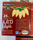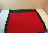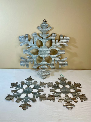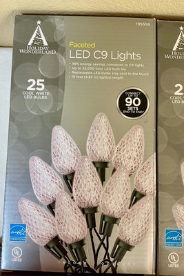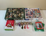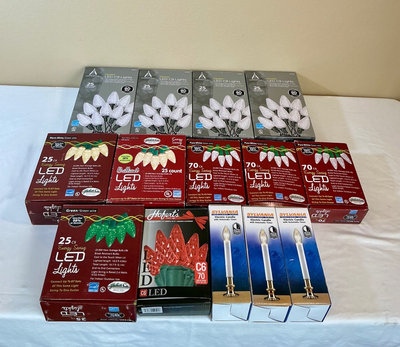 A collection of holiday decor items including metal snowflakes, a red decorative sleigh, a red-and-green Christmas tree skirt, Christmas craft and baking kits, bead tassel ornaments, holiday puzzles, and multiple LED light strings and bulbs, along with two plastic, divided storage boxes.
