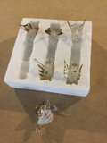 A collection of Christmas decorations including six clear glass angel ornaments with gold-toned wings and hooks,