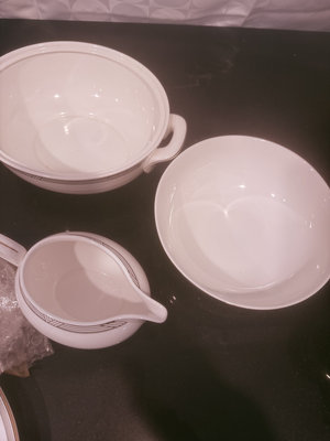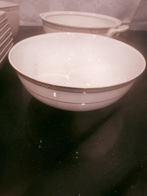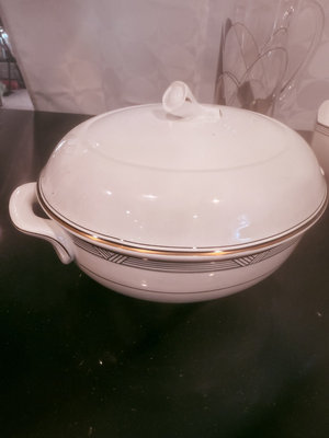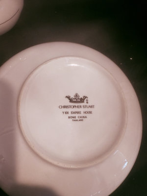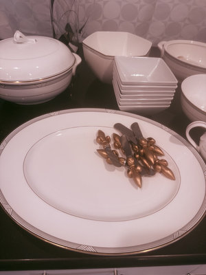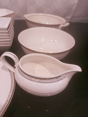 White Christopher Stuart bone china dinnerware set with thin geometric gold trim, including a large dinner plate, bowls of two sizes, a covered tureen, a gravy boat, a stack of square bowls, a deep serving dish, a tall glass pitcher, and a clear glass vase; bottom mark reads 'Christopher Stuart Empire House Bone China Thailand'; bronze-toned leaf-shaped utensils rest on the plate.