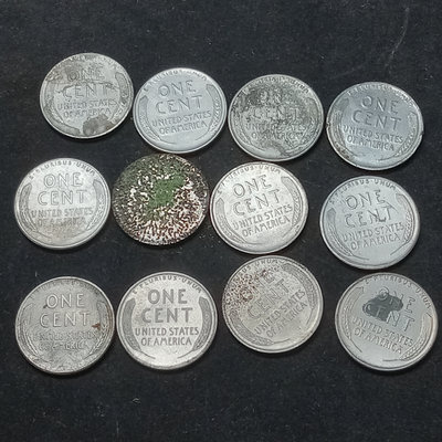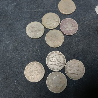 1857/1858 One Cent pieces. 1850s 3-cent piece with shield and 6-pointed star, well worn. 1864 2-cent piece, appears to have been shellacked. 1899, 1906, 1907 Indian Head once cent pieces. Buffalo nickels, unknown date. Dozen steel pennies. 28 pieces.