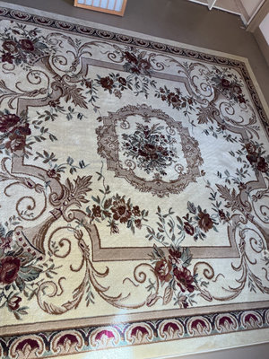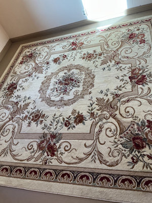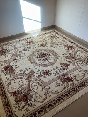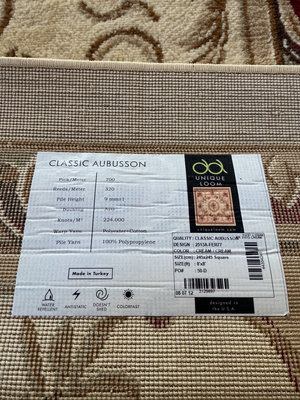 Cream-colored area rug with an ornate central medallion, scrolling vines, and a floral border in beige, tan, and burgundy. The design is labeled Classic Aubusson by Unique Loom; made in Turkey. Size: 245x245 cm (8x8 ft).
