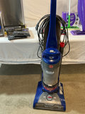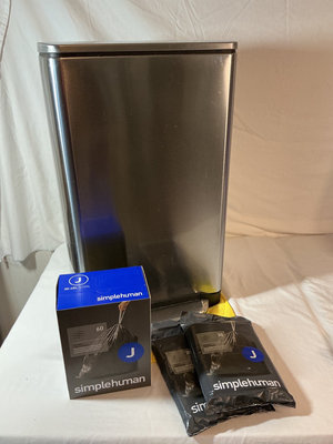 A collection of cleaning equipment and supplies including a blue Hoover WindTunnel vacuum, a purple Swiffer-style mop system with replacement pads, two large Swiffer cleaning solution bottles, a stainless steel trash can with Simplehuman trash bags.