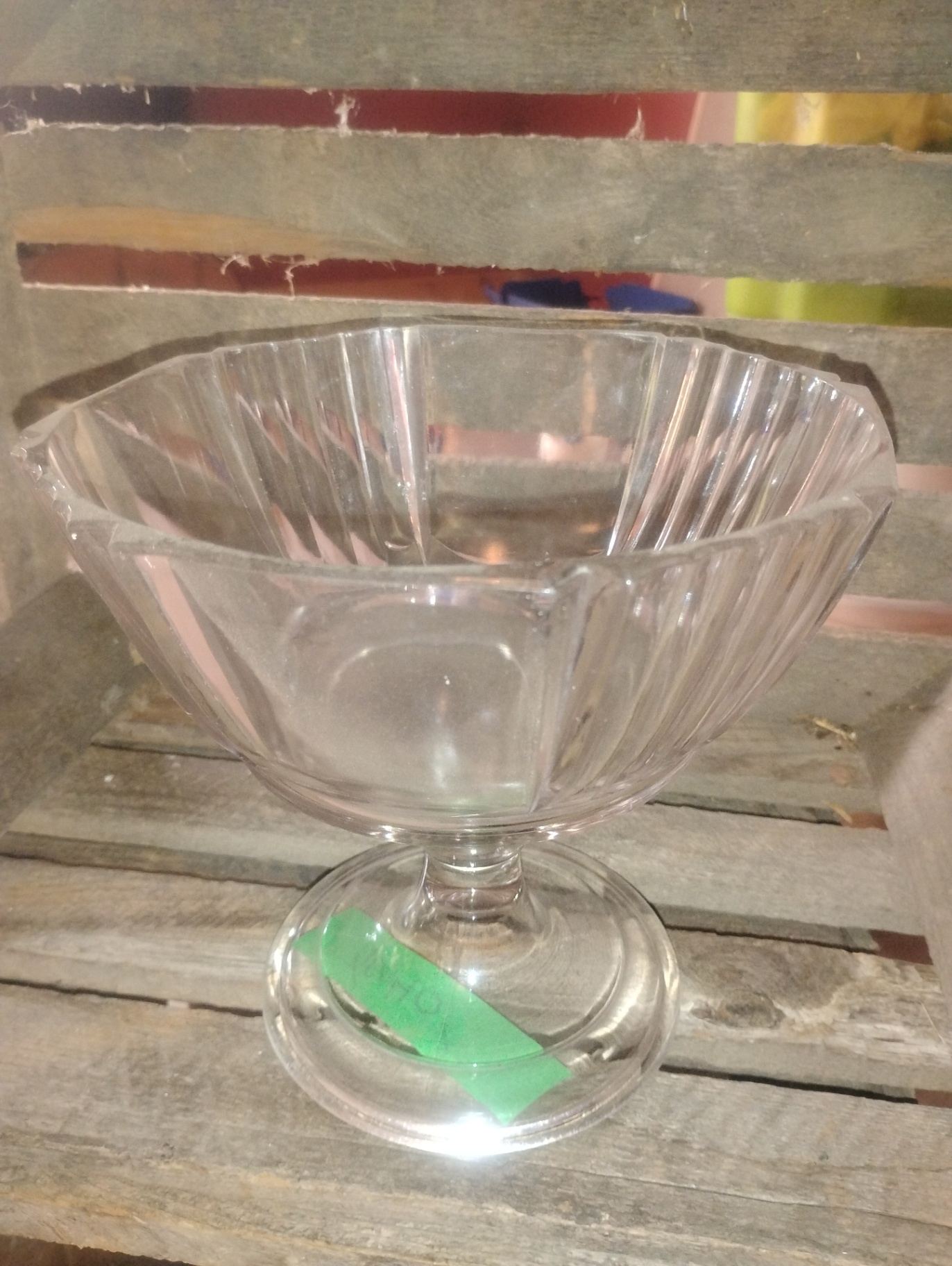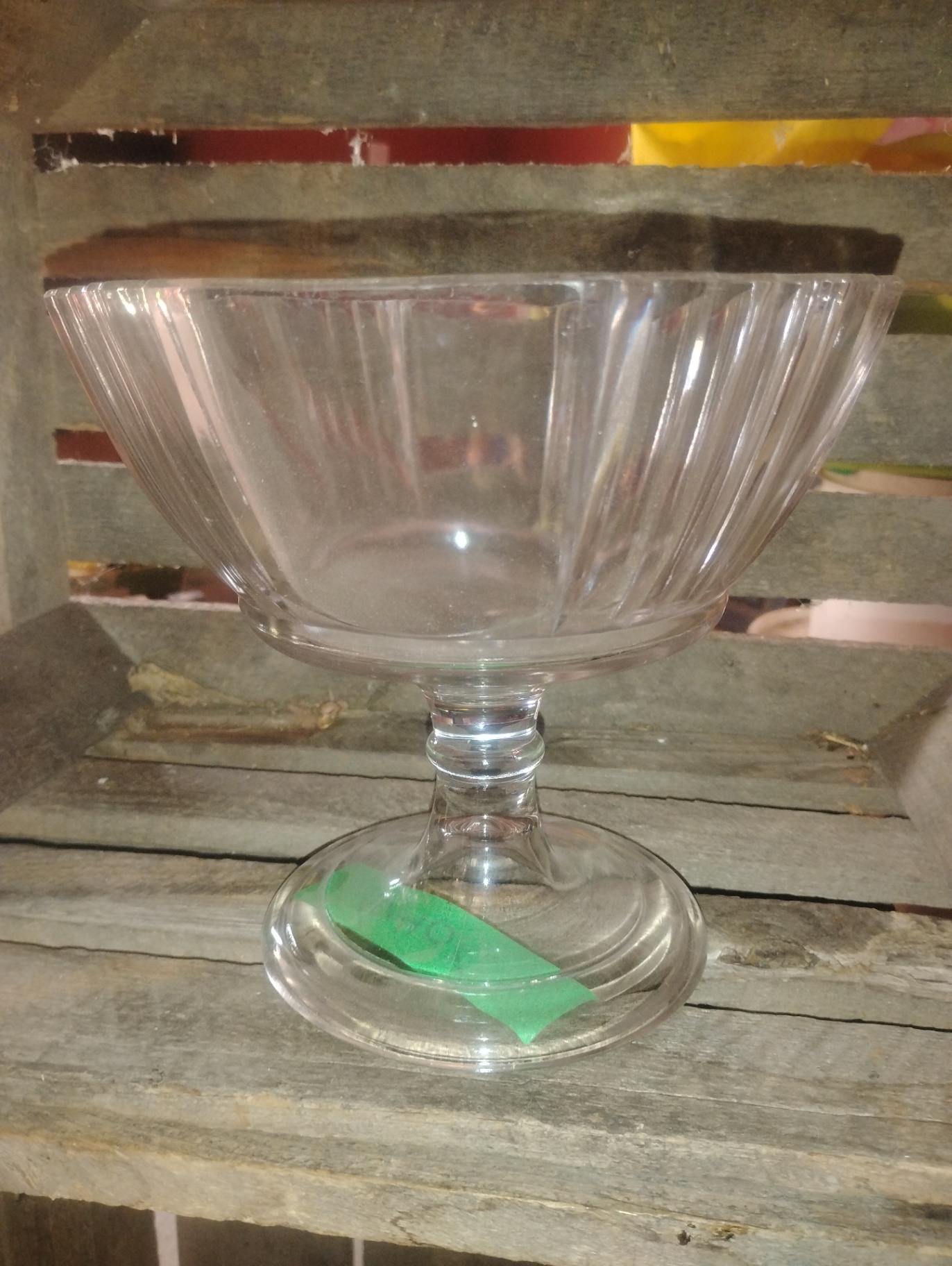 A clear glass pedestal bowl with ribbed sides and a round foot.