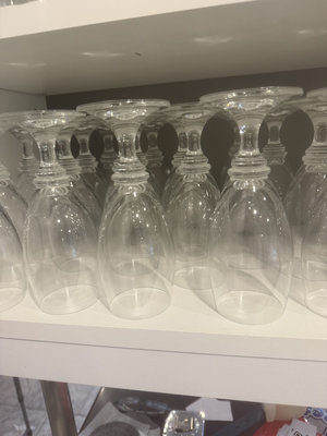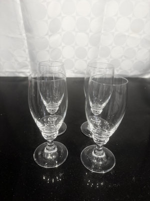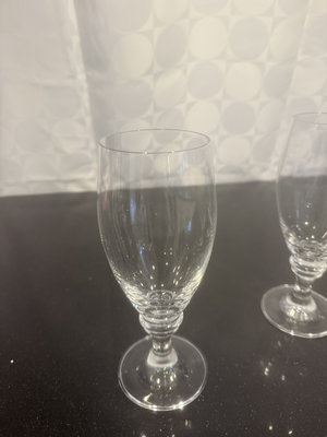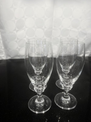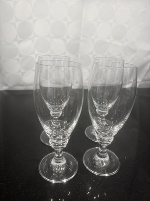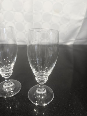 A collection of clear glass stemware, including wine glasses and water goblets.