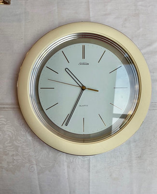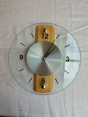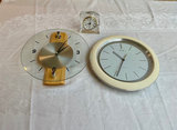 Two wall clocks, one plastic and glass and one glass and wood both battery operated. The final small tabletop glass clock is also battery operated.