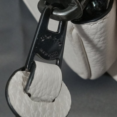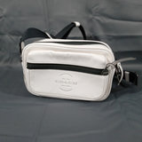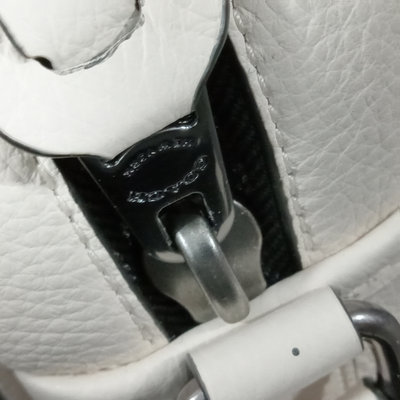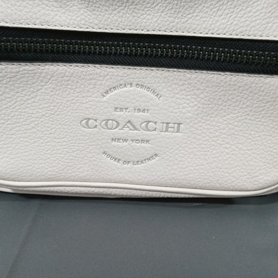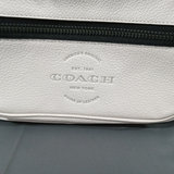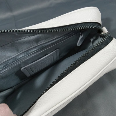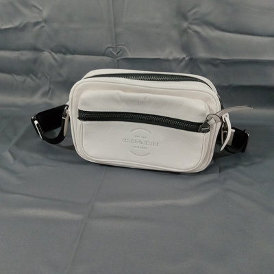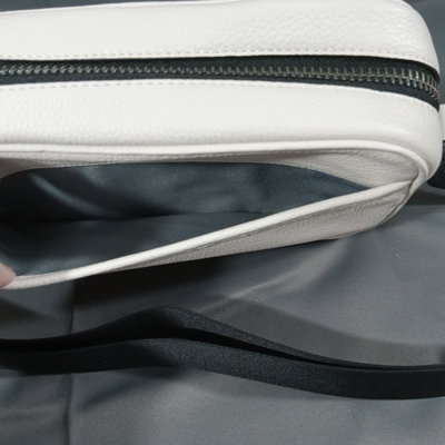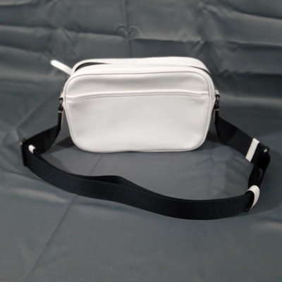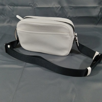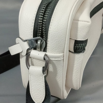 Thompson style small crossbody camera bag in Chalk, white pebbled leather with grey fabric interior, No. D2244-C6584. 10x3.5x6.75. 1 piece.