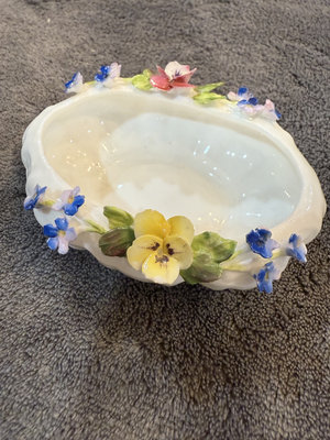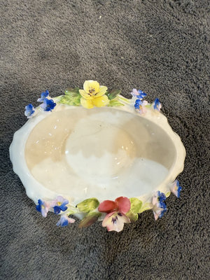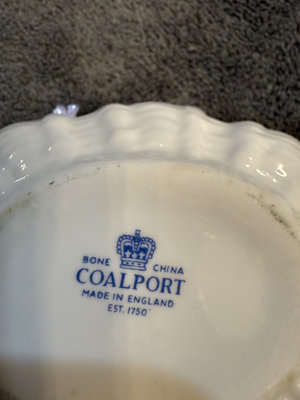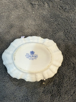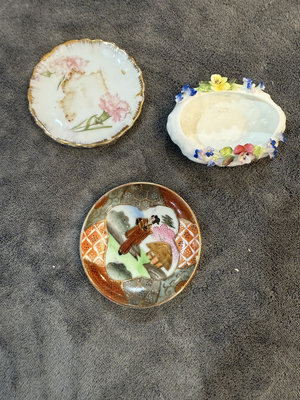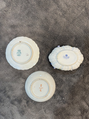 A three‑piece collection of bone china porcelain dishes by Coalport (England), featuring a scalloped-edged plate with gilt rim and pink floral motif, a flower‑decorated oval trinket dish with colorful raised blooms, and a round hand‑painted plate with a figure in traditional dress and decorative border; all pieces bear Coalport backmarks (England). 3-31/2"