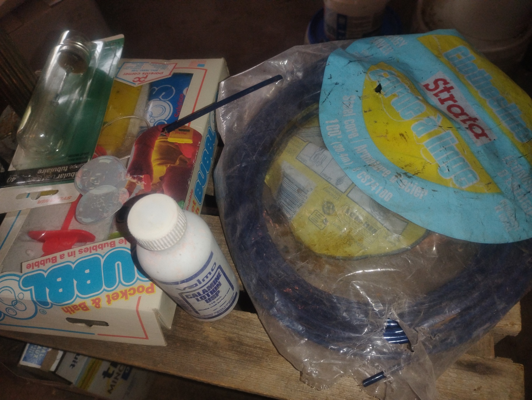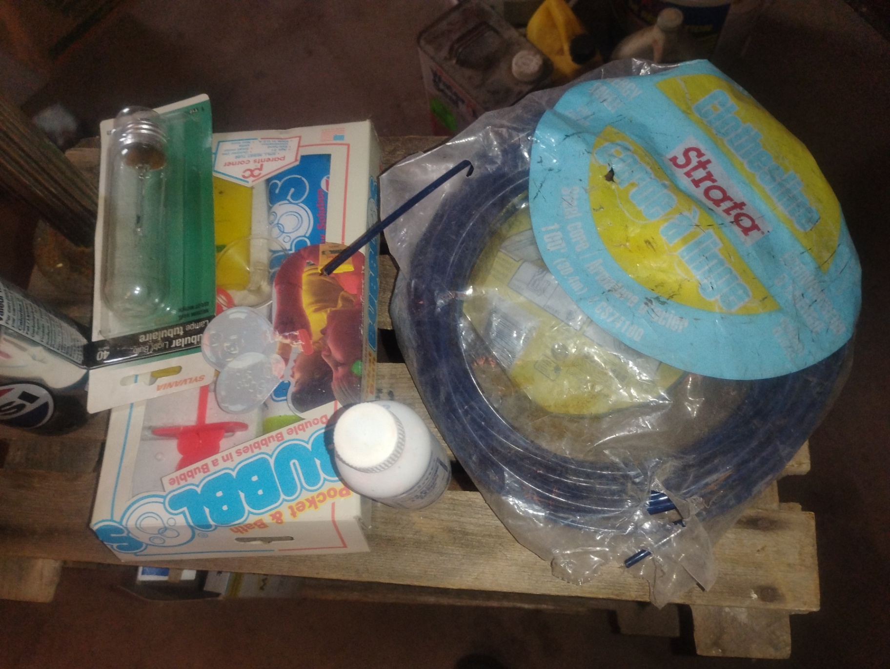 A collection of items including a coiled blue garden hose in plastic, bottles of cleaning solutions, and assorted boxes and hardware items.