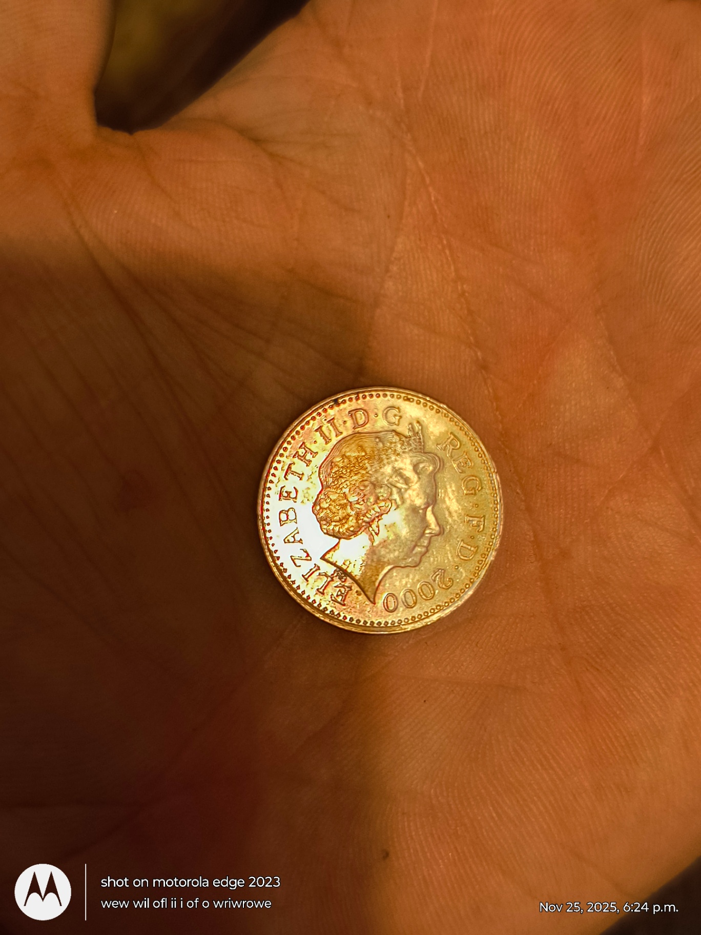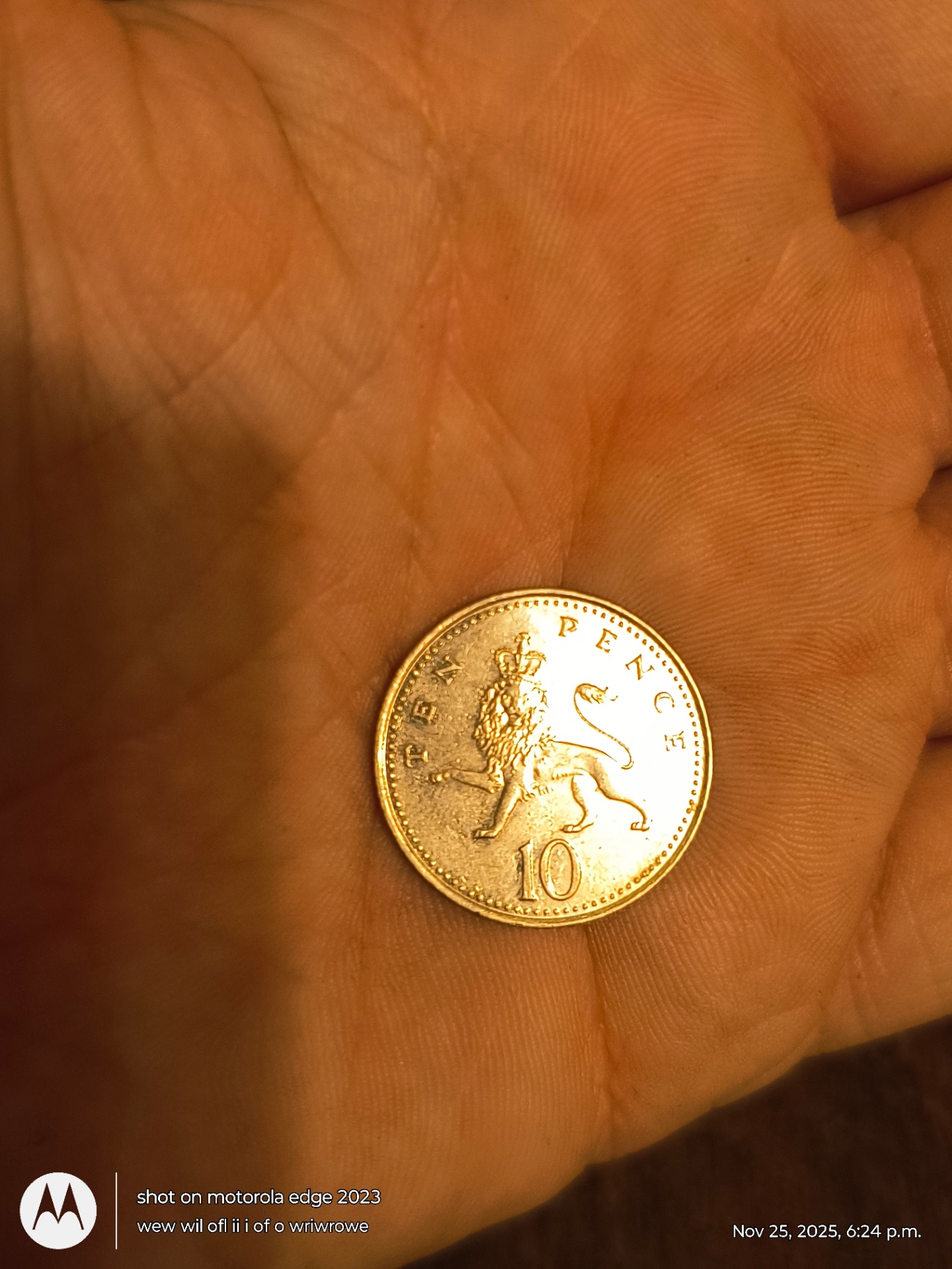 A hand holds two coins: a ten pence coin featuring a lion design, and a Queen Elizabeth II portrait coin inscribed ELIZABETH II D.G. REG F.D. with the year 2000.