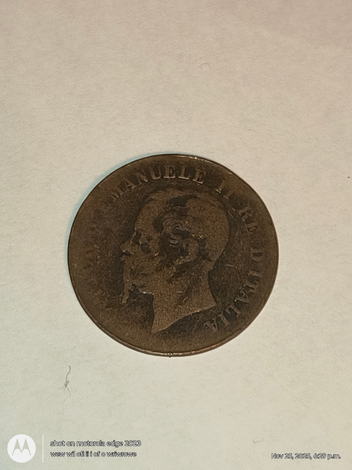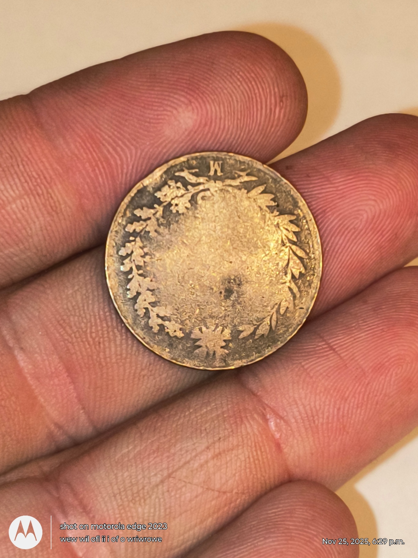 Two coins: one coin features a laurel wreath border surrounding a worn, blank central field; the other coin depicts a male bust in profile with lettering around the rim.