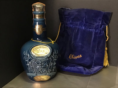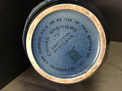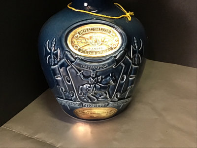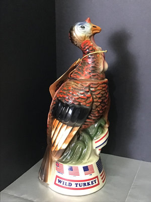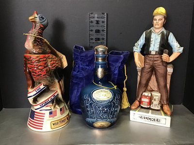 The Spirit of 76 Wild Turkey, Austin Nichols, limited edition no. 5, 12.5h. Chivas with velvet bag, by Copeland Spode, made in England, 9h. Old Bardstown Trucker, 12.5h. 3 pieces.