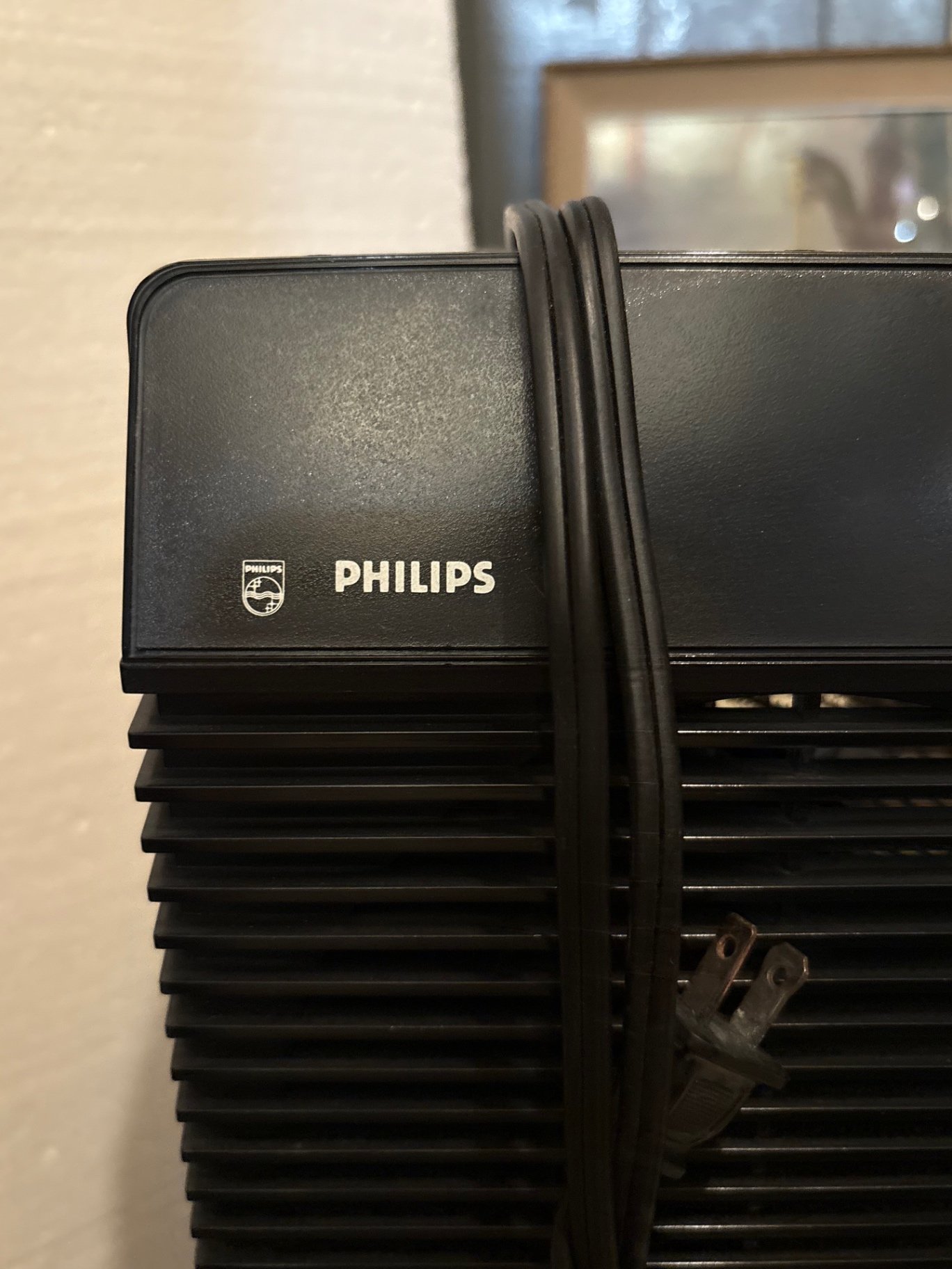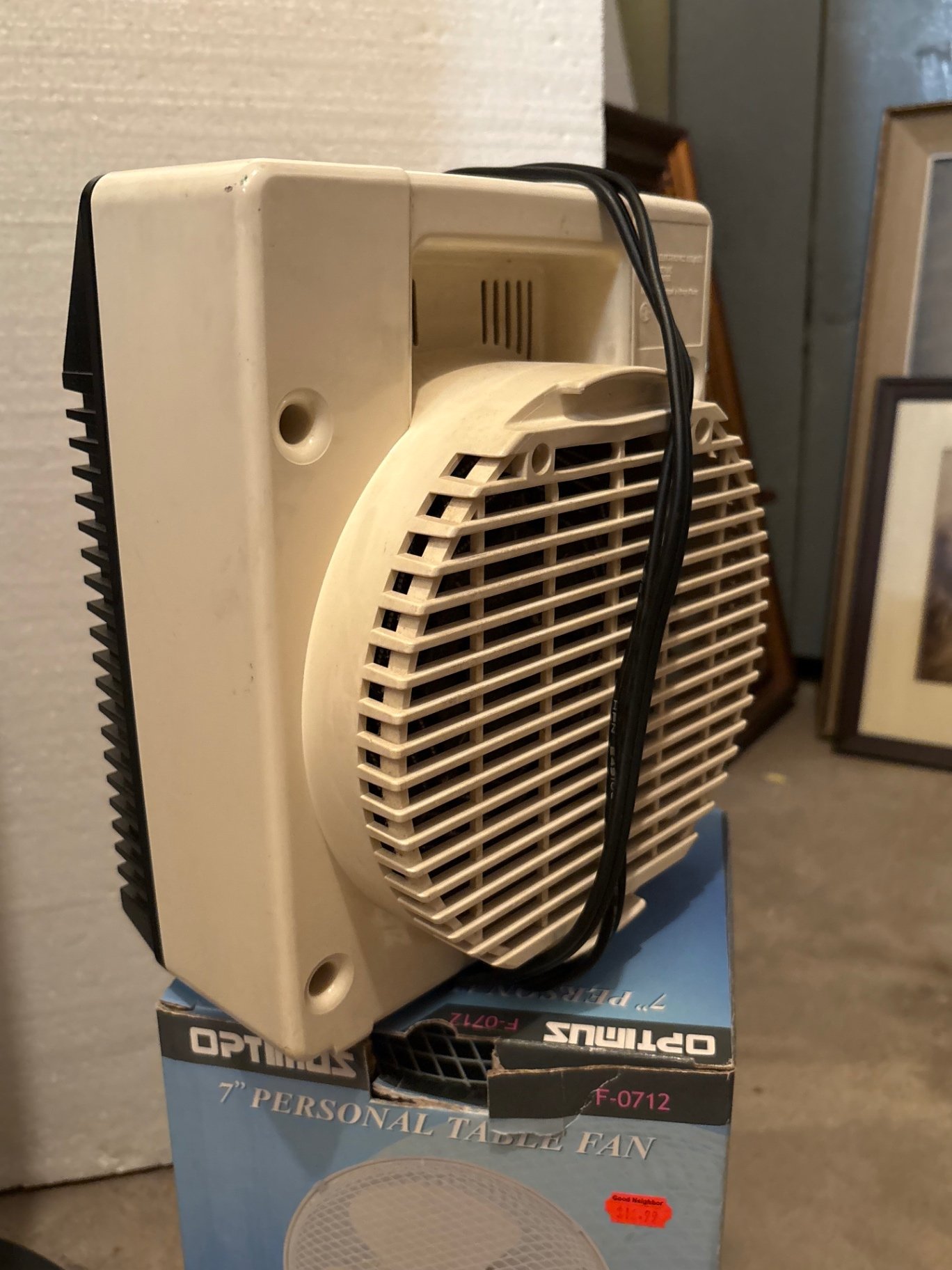 A collection of portable electric fans including a tall floor-standing tower fan (Seville Classics missing remote), a small standing fan (Philips) a white desk/table fan, and accompanying packaging. Dimensions: Large standing fan: 12”x11”x38” Small standing fan: 7”x7”x14”