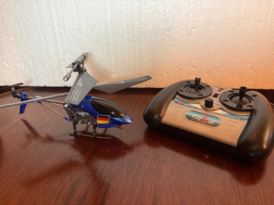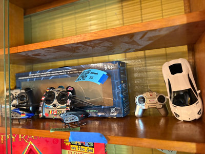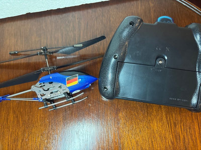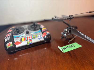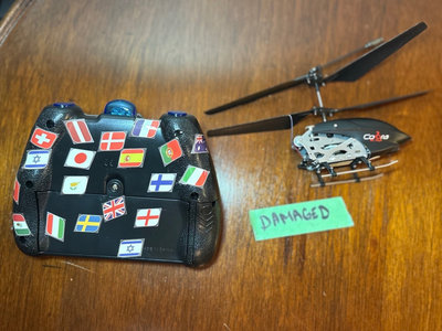 A group of radio-controlled devices including two helicopters (one is damaged), a white sports car model, and remote controllers with various stickers. **BRING OWN PACKING MATERIALS, NOT TESTED FOR COMPLETENESS & FUNCTIONALITY.