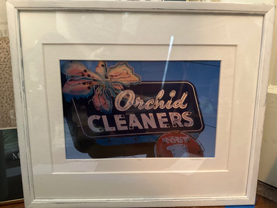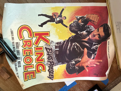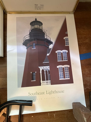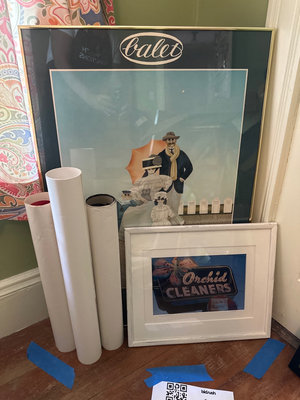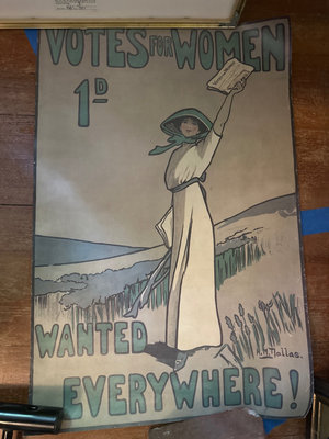Several vintage posters and prints, including framed advertising art and illustrations such as an Orchid Cleaners advertisement, a Votes for Women poster, King Creole poster and a Lighthouse print.
