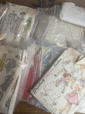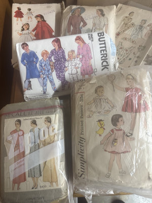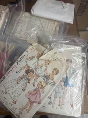 A set of vintage sewing pattern envelopes from brands such as McCall's, Simplicity, and Butterick, featuring illustrations of dresses and children's outfits, stored in plastic packaging.