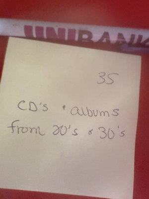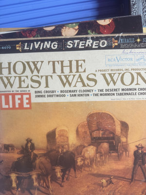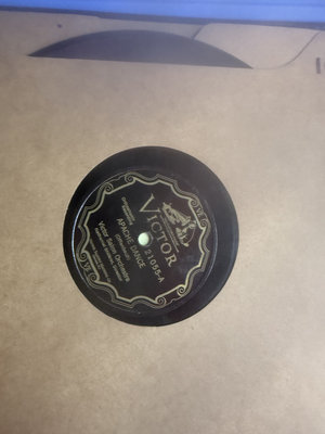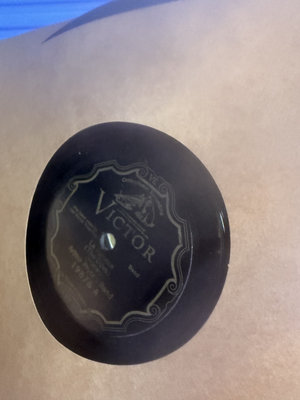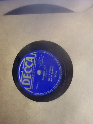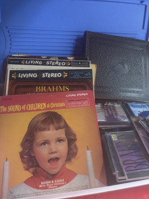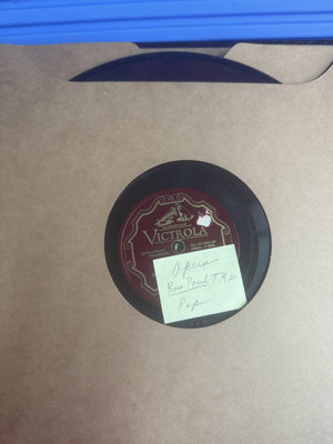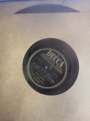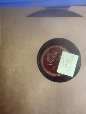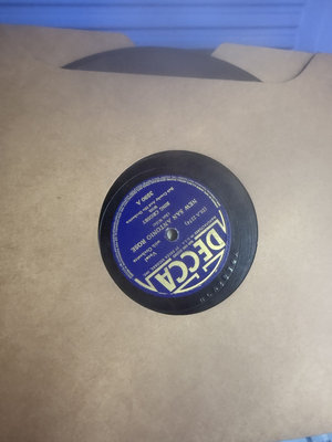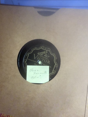 An assortment of vintage vinyl records and related packaging, featuring labels from Victor, Decca, RCA and Audiodisc, along with record sleeves.