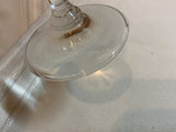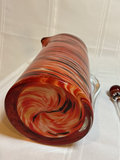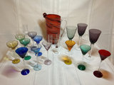 A collection of colored glassware including twisted-stem champagne goblets in green, blue, teal, yellow, red and purple, clear small glasses with embedded fruit motifs, and a large red swirled hand blown pitcher with a handle.