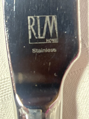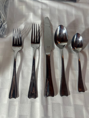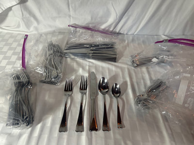 12 of each Dinner and Salad Forks, 12 knives, and 12 spoons and soup spoons. RLM, the Robert Lee Morris Studio, is the manufacturer. These are very well made. Stainless Steel.