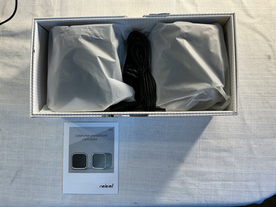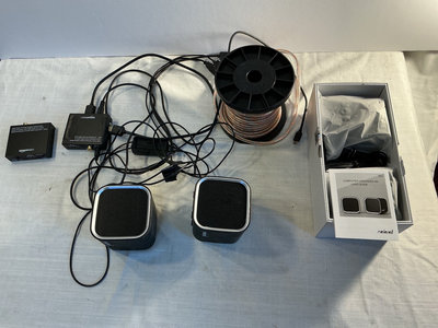 A computer speaker system with 4 Molorol speakers (2 brand new ones in original box), 2 audio supports, and a roll of a copper wire coil.