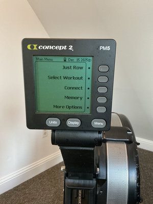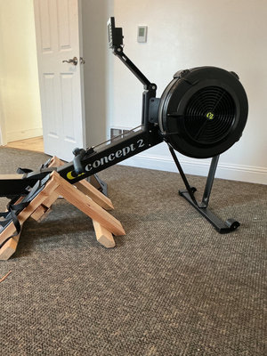 A Concept2 indoor rowing machine with a working PM5 display, footplates, sliding rail and flywheel assembly, includes manual. Previous owner made his own wood foot platform but the originals are included. Just short of 8 feet long widest point is 26 inches.
