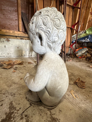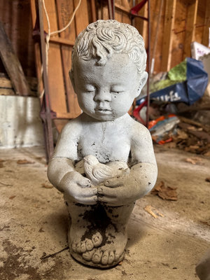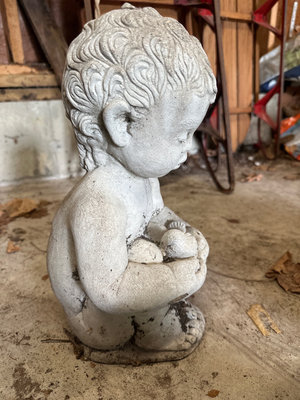 A concrete statue of a child sitting with legs folded, holding a small bird in its hands. Heavy