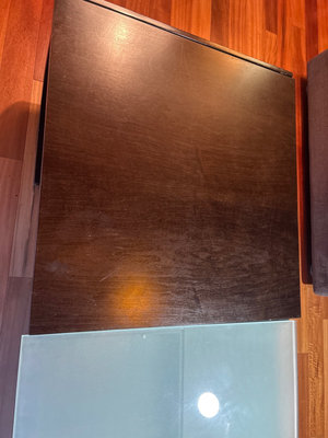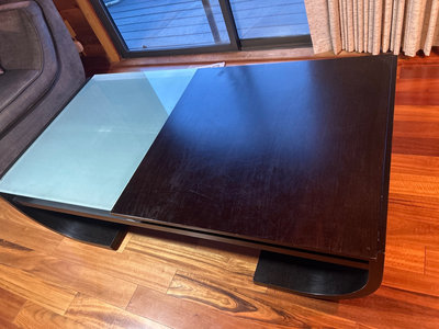 52” x 28” x 14” high. The wood is a black finish and shows some wear. but a smoky mint green glass cover. Built in shelves, very stylish looking.