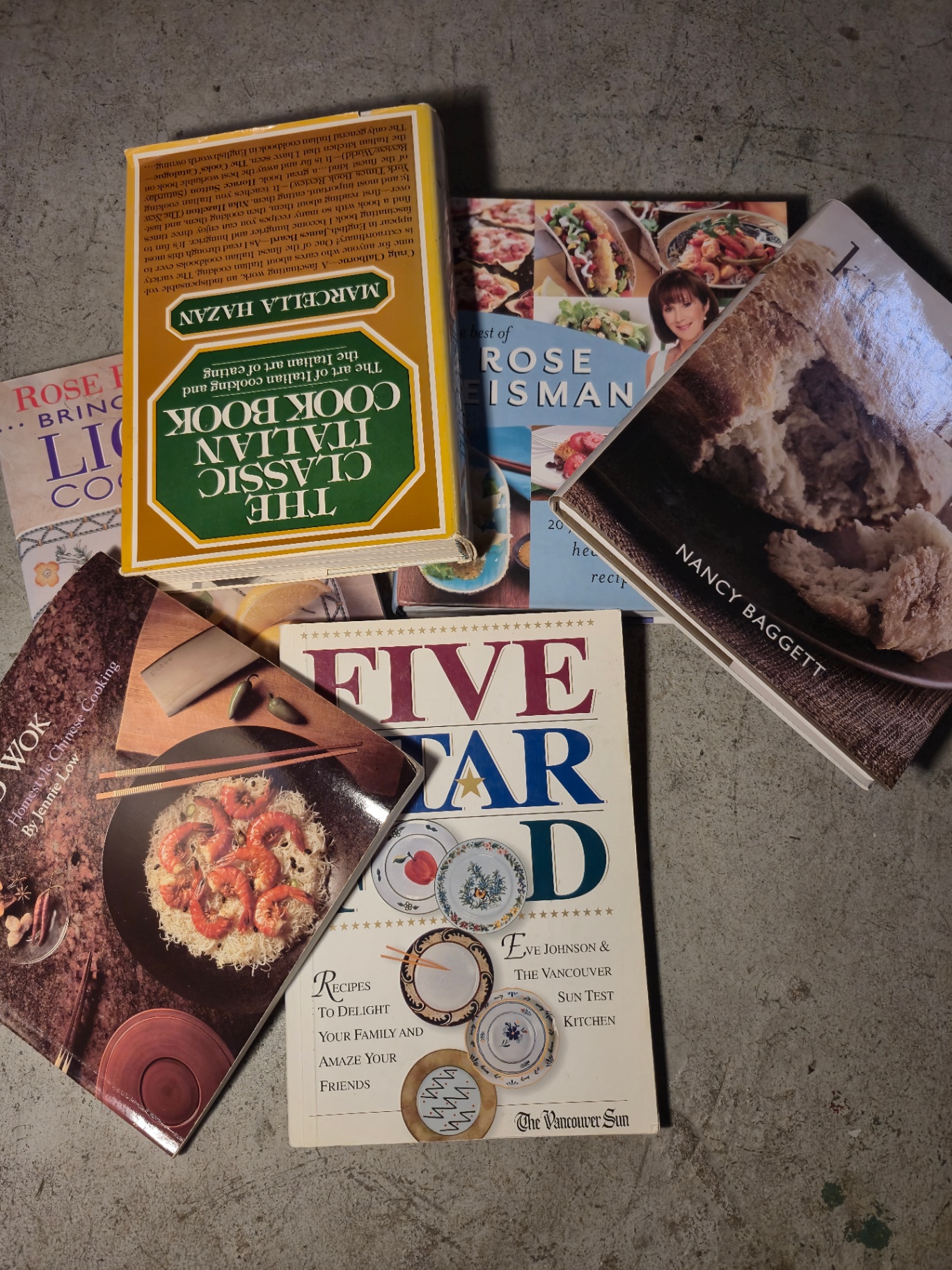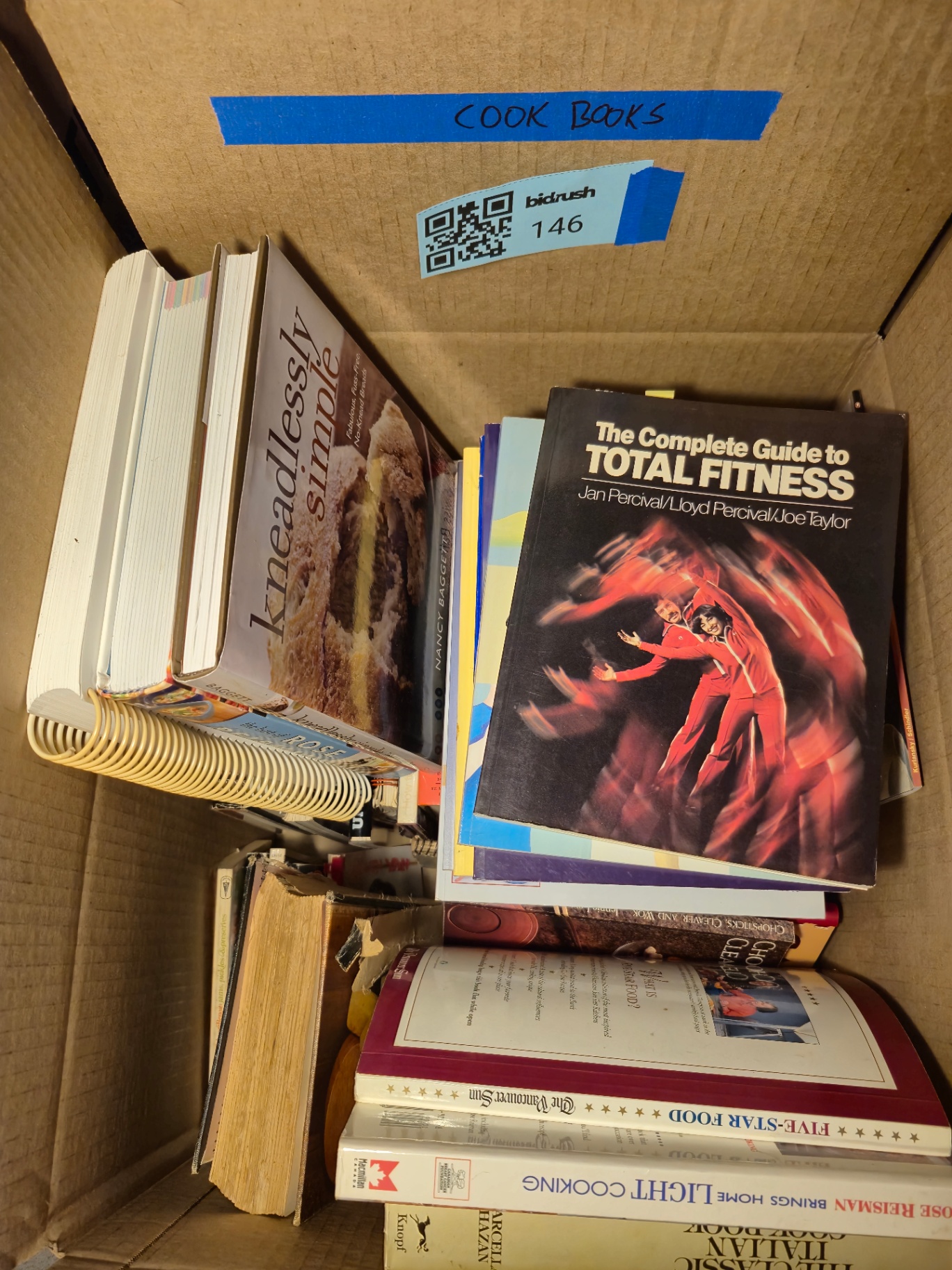 A mixed collection of cookbooks and lifestyle reference books, including titles such as Five Star Food and The Complete Guide to Total Fitness.