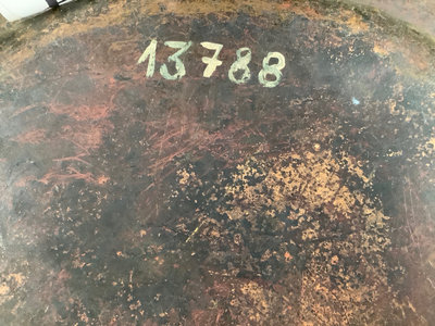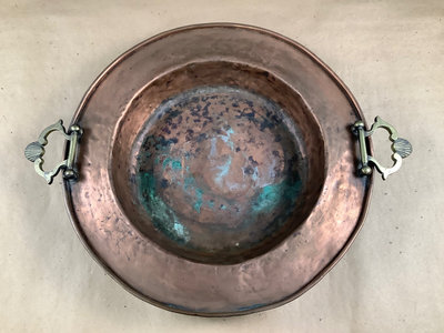 Heavy hammered copper serving bowl or paella pan with brass cast handles with seashells detail. No. 13788 on bottom, no maker, 18d. 1 piece.