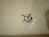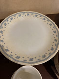 Corelle -White ceramic dinnerware set featuring a blue floral border, including large dinner plates, smaller plates, bowls, and stacked mugs. 7 dinner, 5 small plates, 8 cups, 7 bowls - dusty, needs cleaning